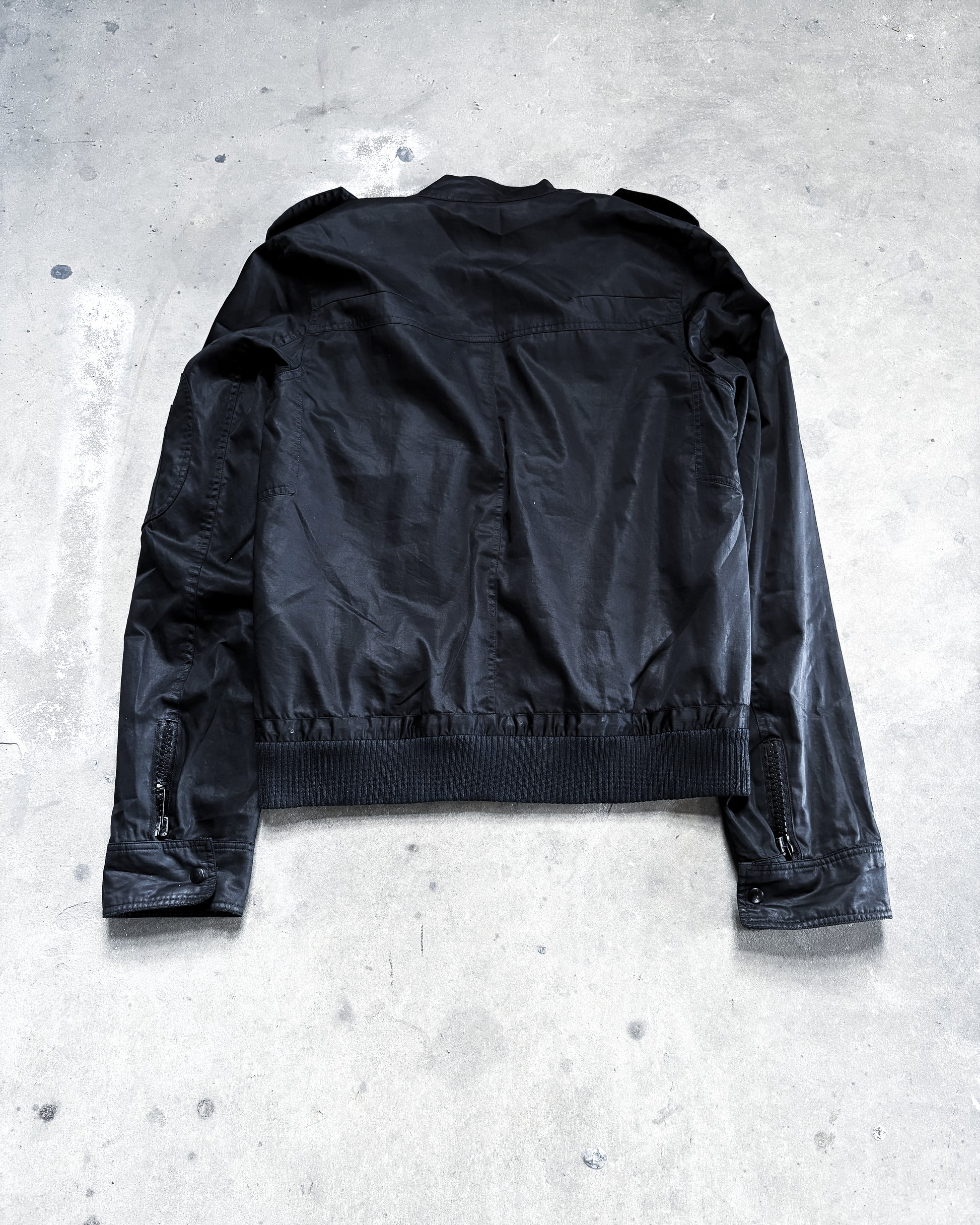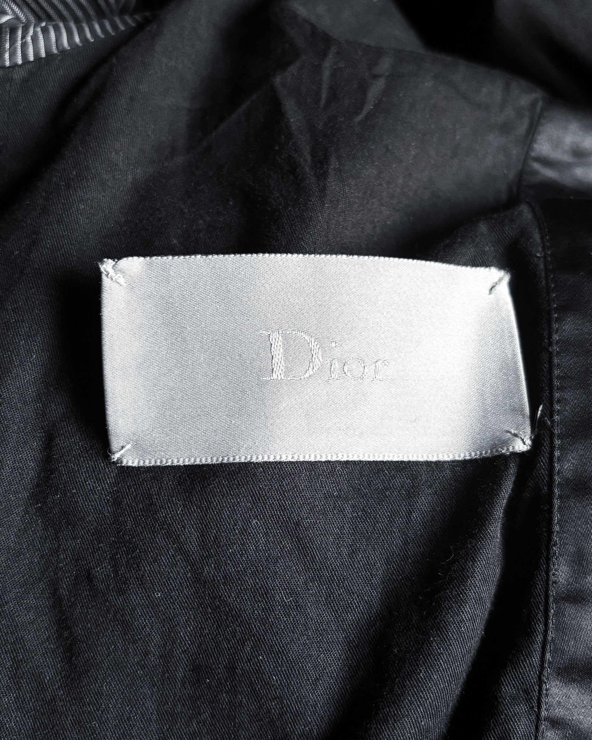 For sale is a Dior Homme utility officer jacket designed by Hedi Slimane for his Spring Summer 2005 “Untitled” collection. This cotton bomber jacket features multiple styles of pockets with heavy duty zippers as seen on the runway.