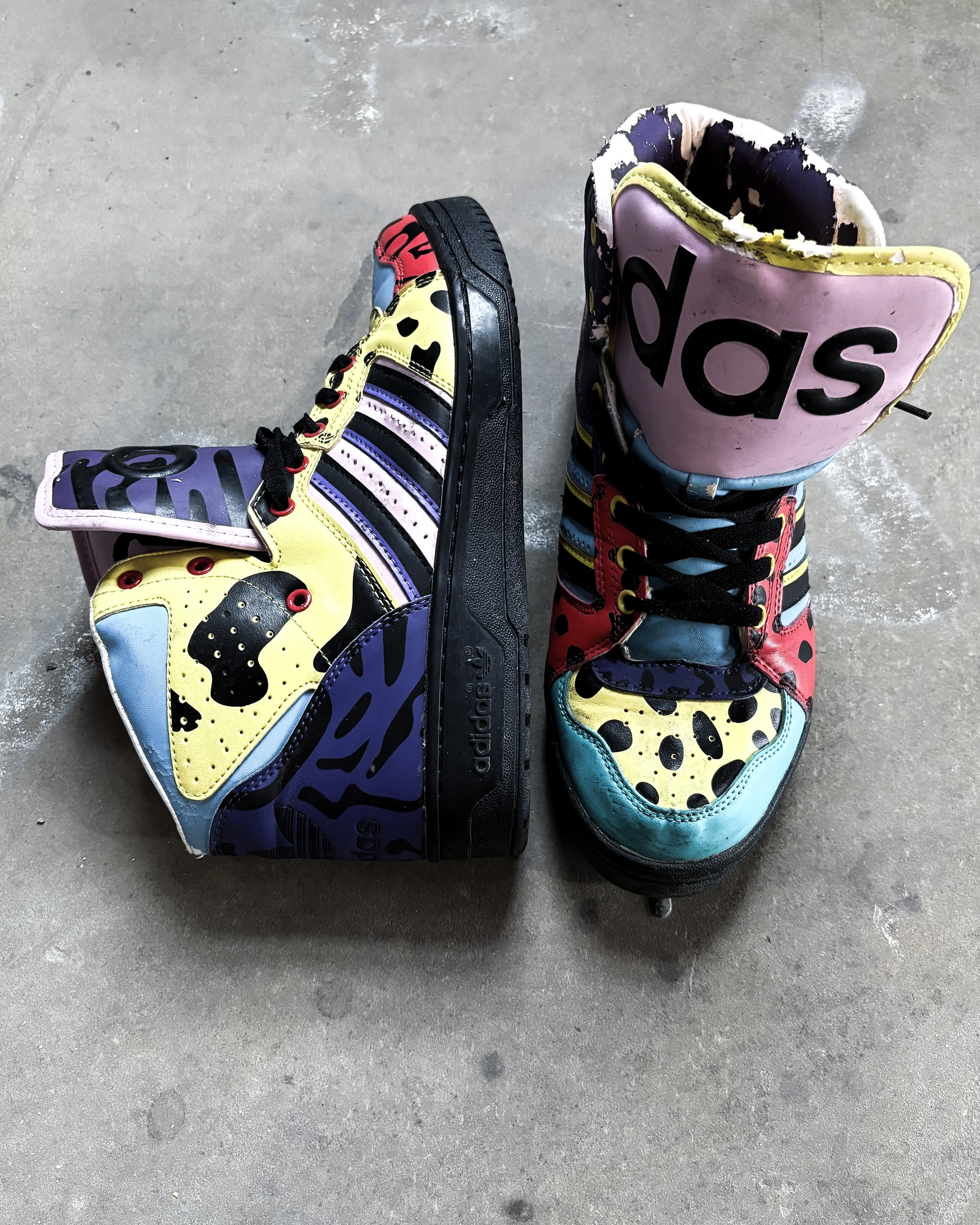 For sale is a pair of super rare Jeremy Scott x Adidas collaboration sneakers. Debuting in 2012 this pair features multiple different animal prints in different colours with an exaggerated tongue.