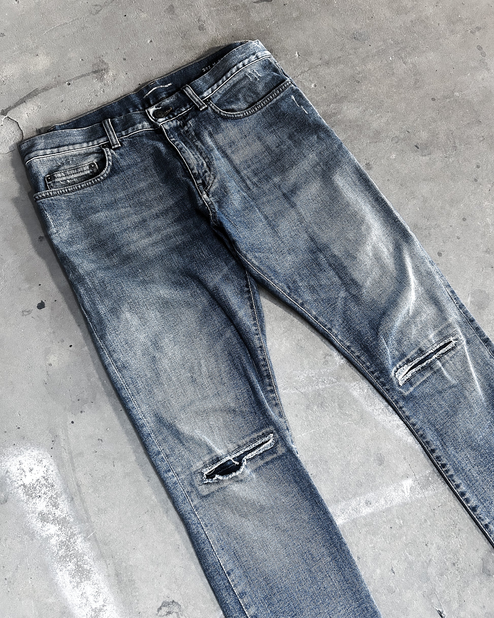 For sale is a pair of Saint Laurent Paris denim by Hedi Slimane featuring repaired rips in the front in a faded blue wash. Features claw marks on the hip similar to his Dior work.