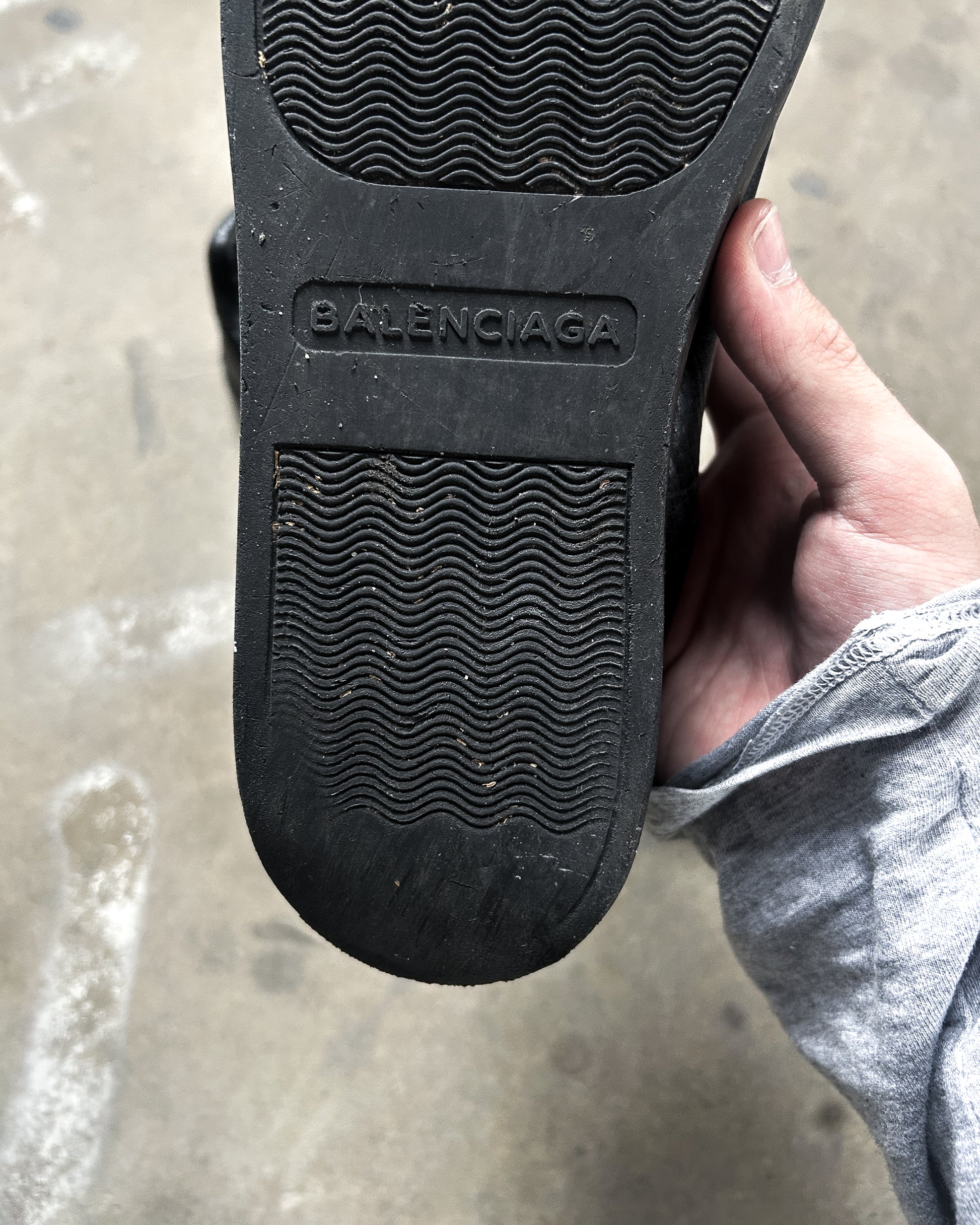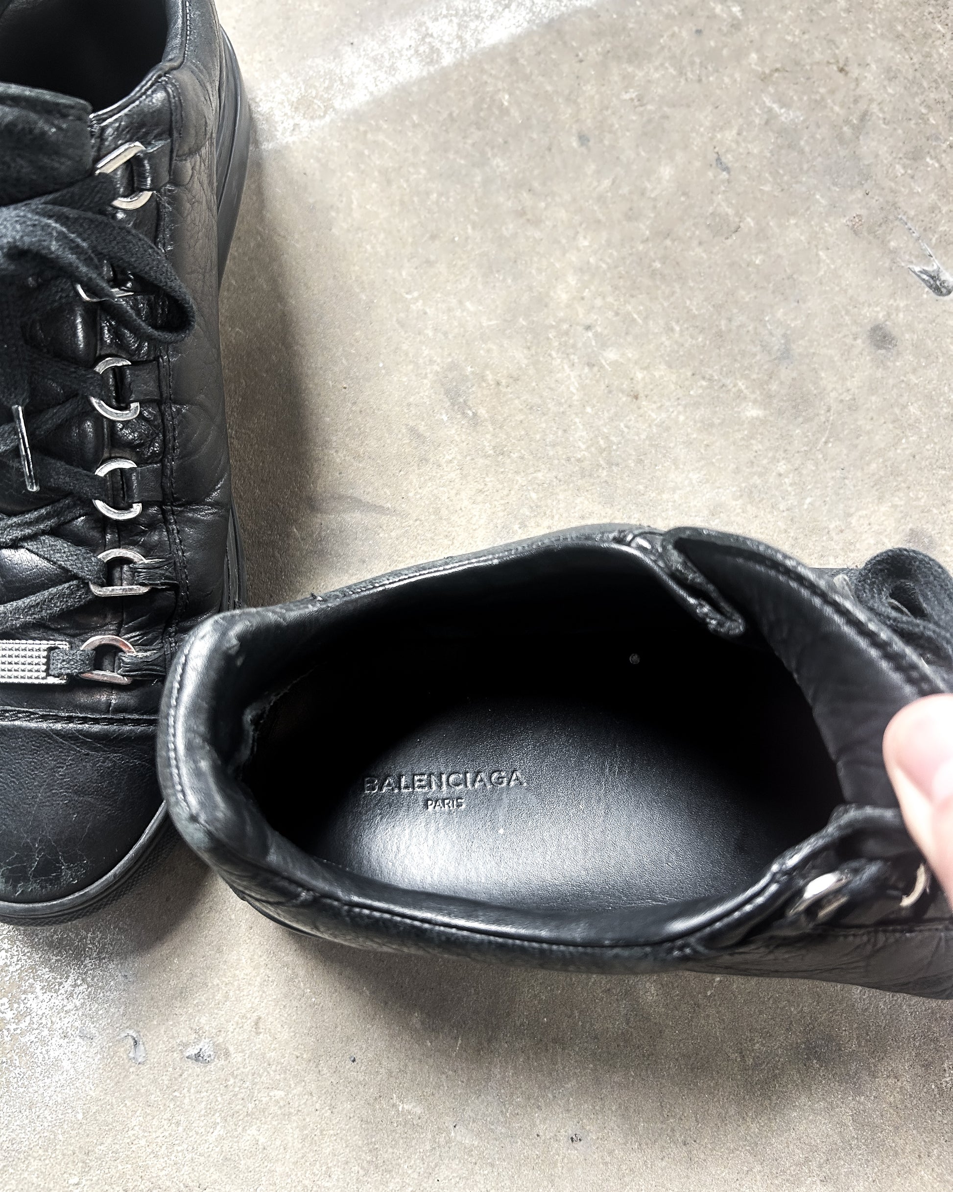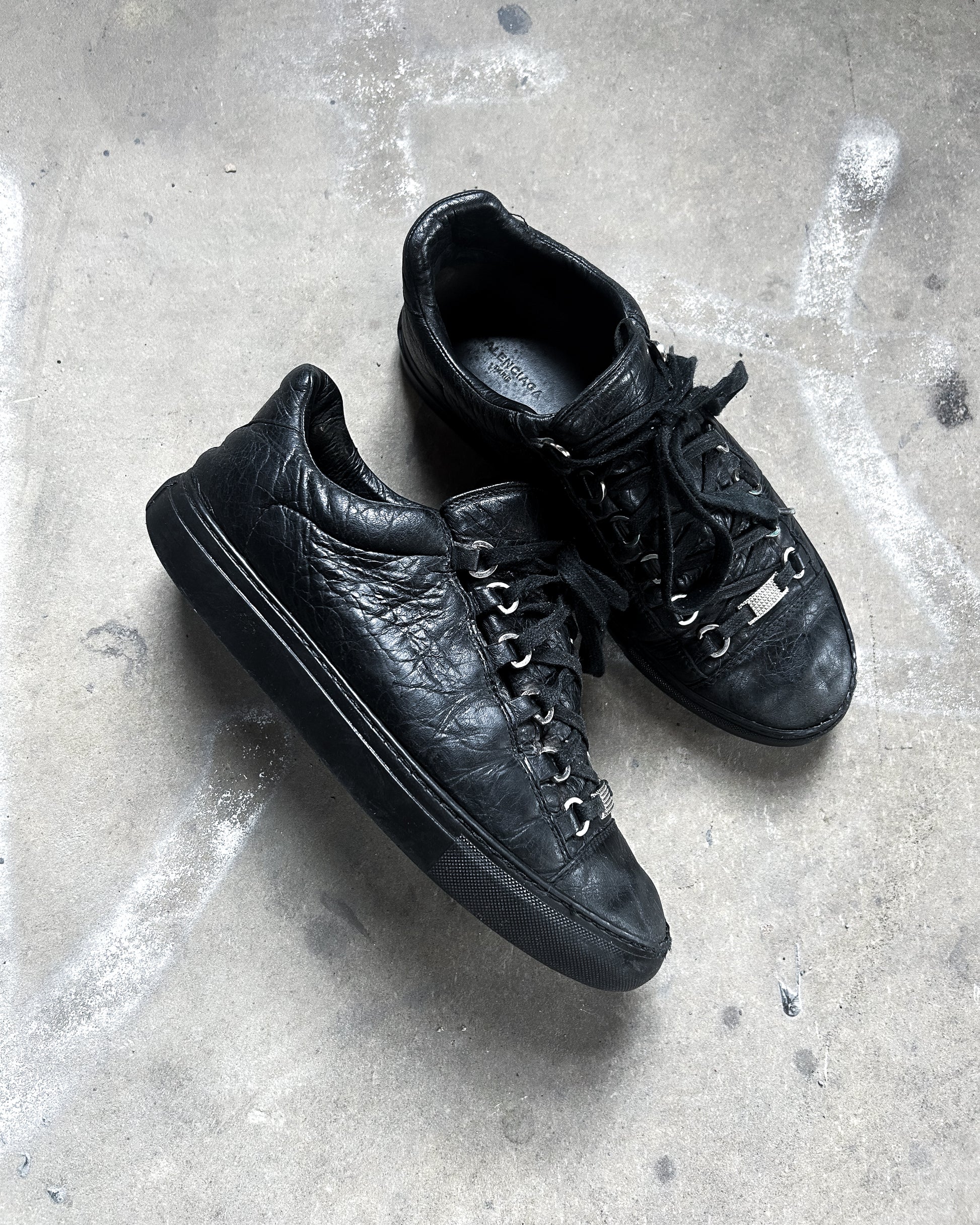 For sale is a pair of Balenciaga Arena sneakers in a black creased calf leather in the low top variant.