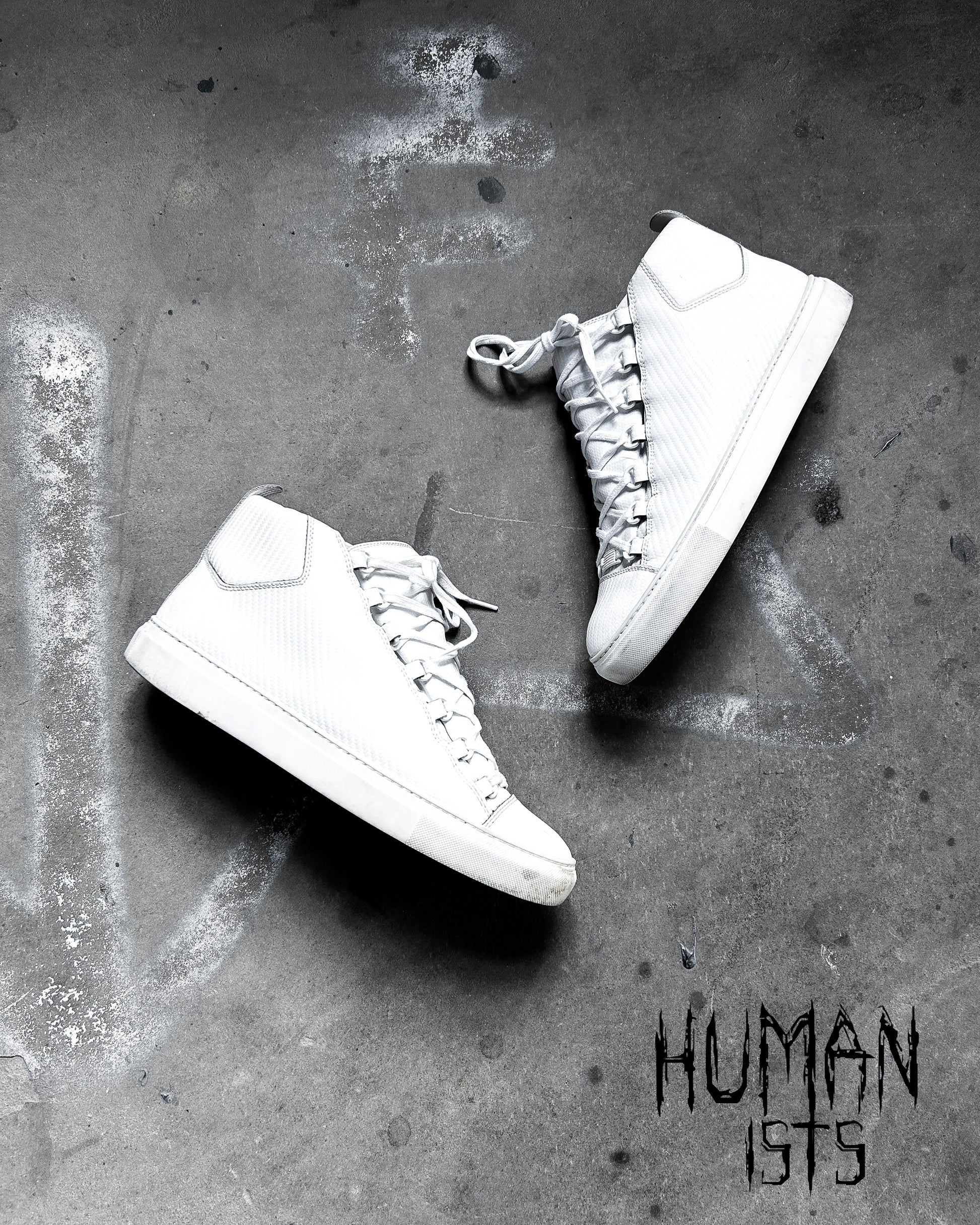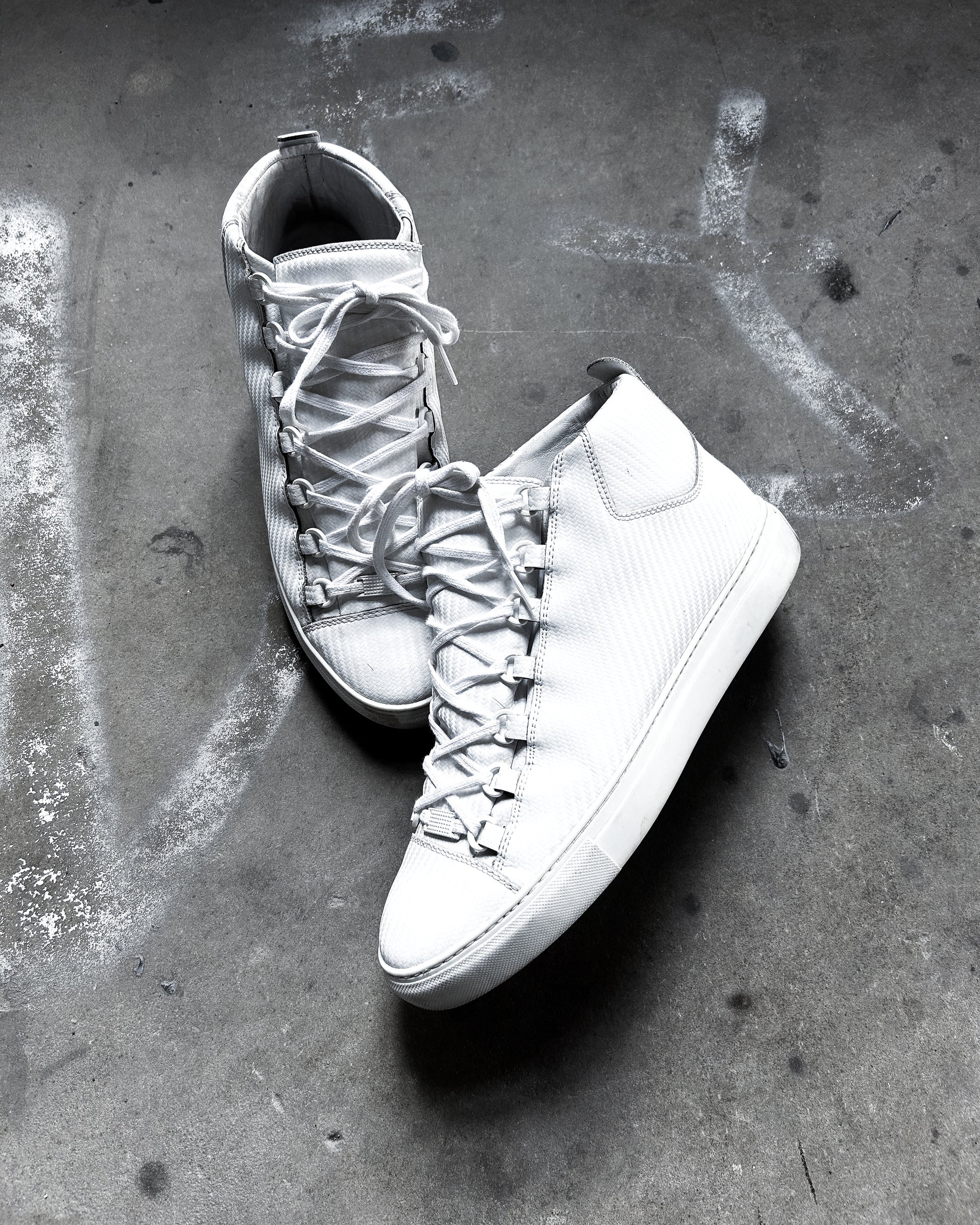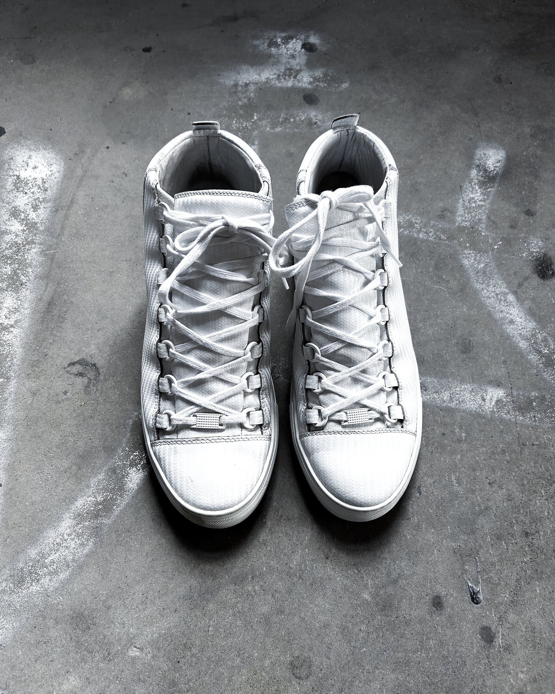 For sale is a pair of Balenciaga white carbon high top arenas in white leather.