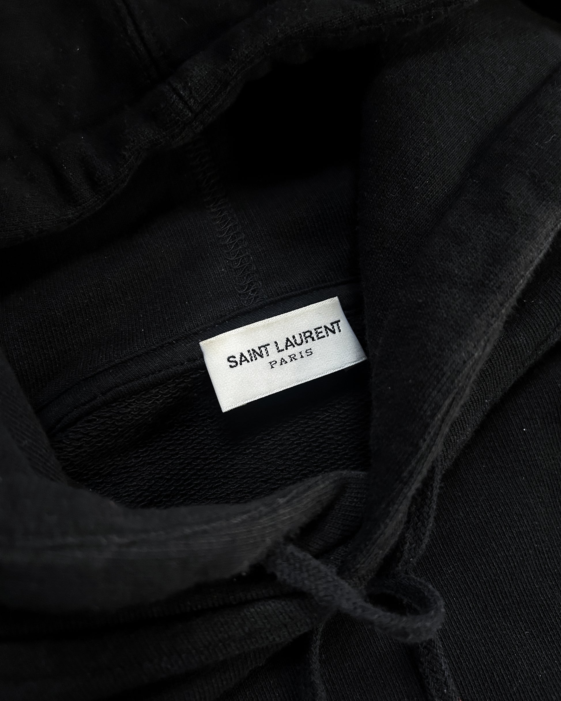 For sale is a Saint Laurent Paris hoodie featuring red and monochrome print on the front.