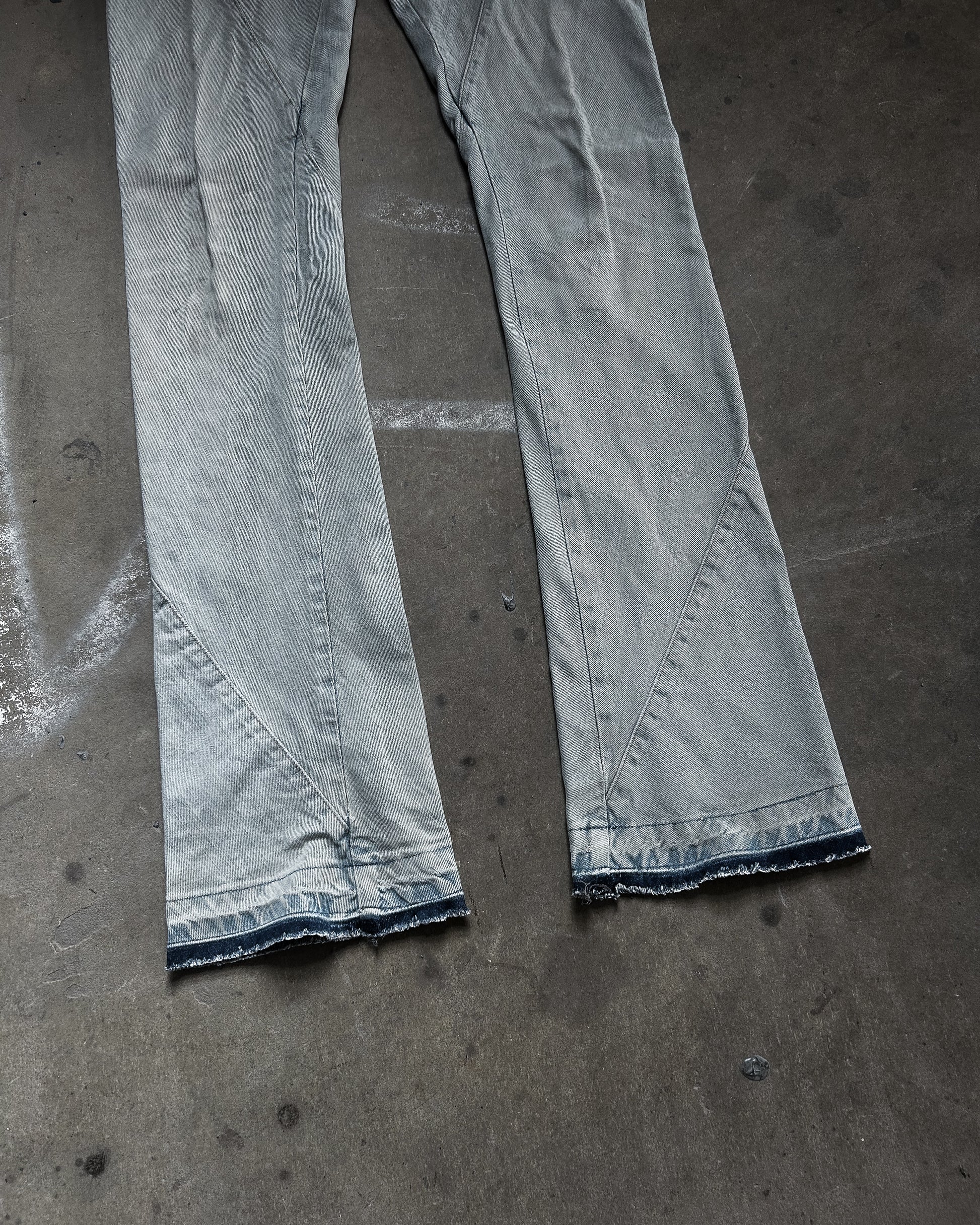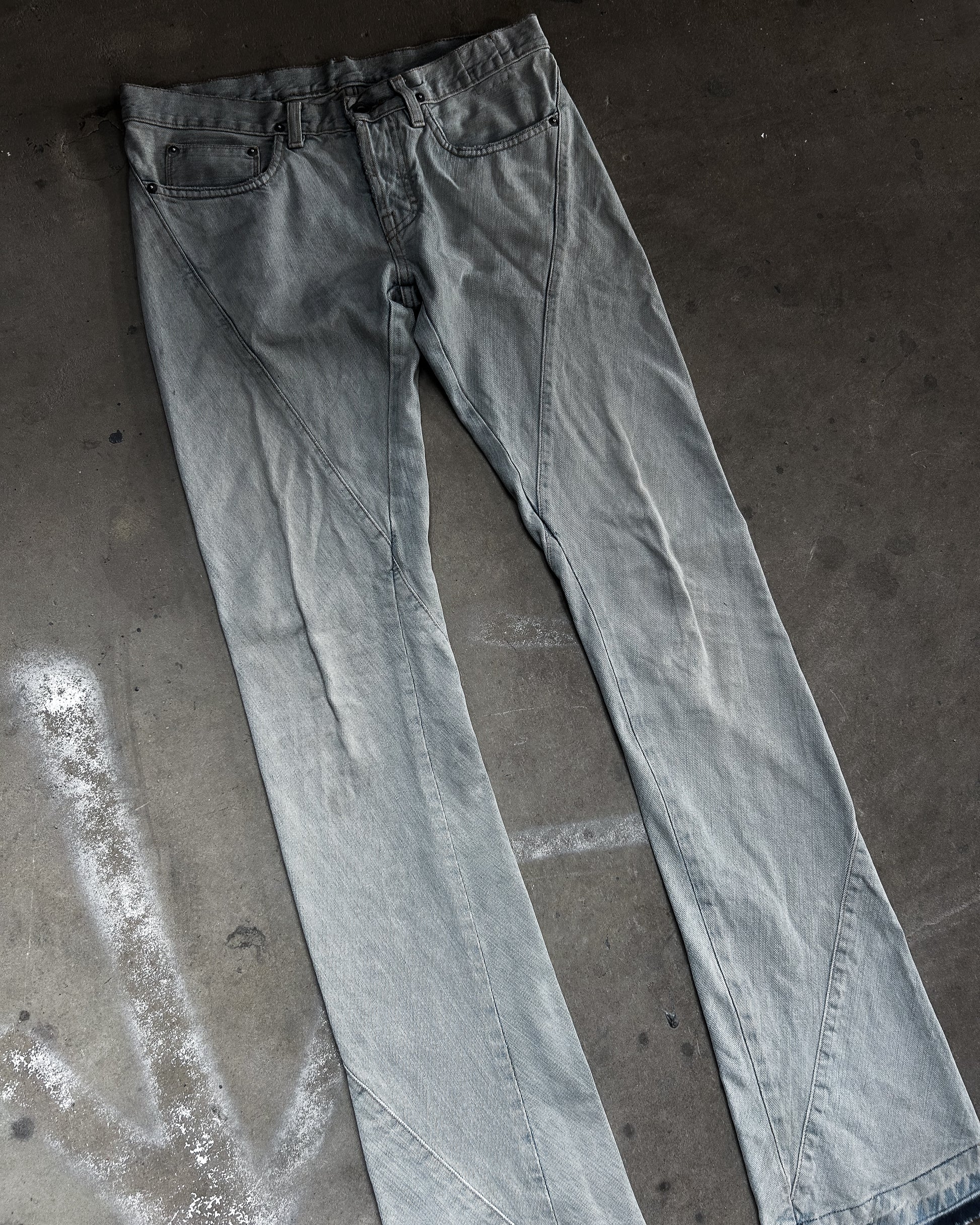 For sale is a pair of Rick Owens Fall Winter 2007 ‘Exploder’ spiral denim. Comes in the dust colourway and the early spiral silhouette which later became the bias cut. Amazing wash and released hems for extra length.