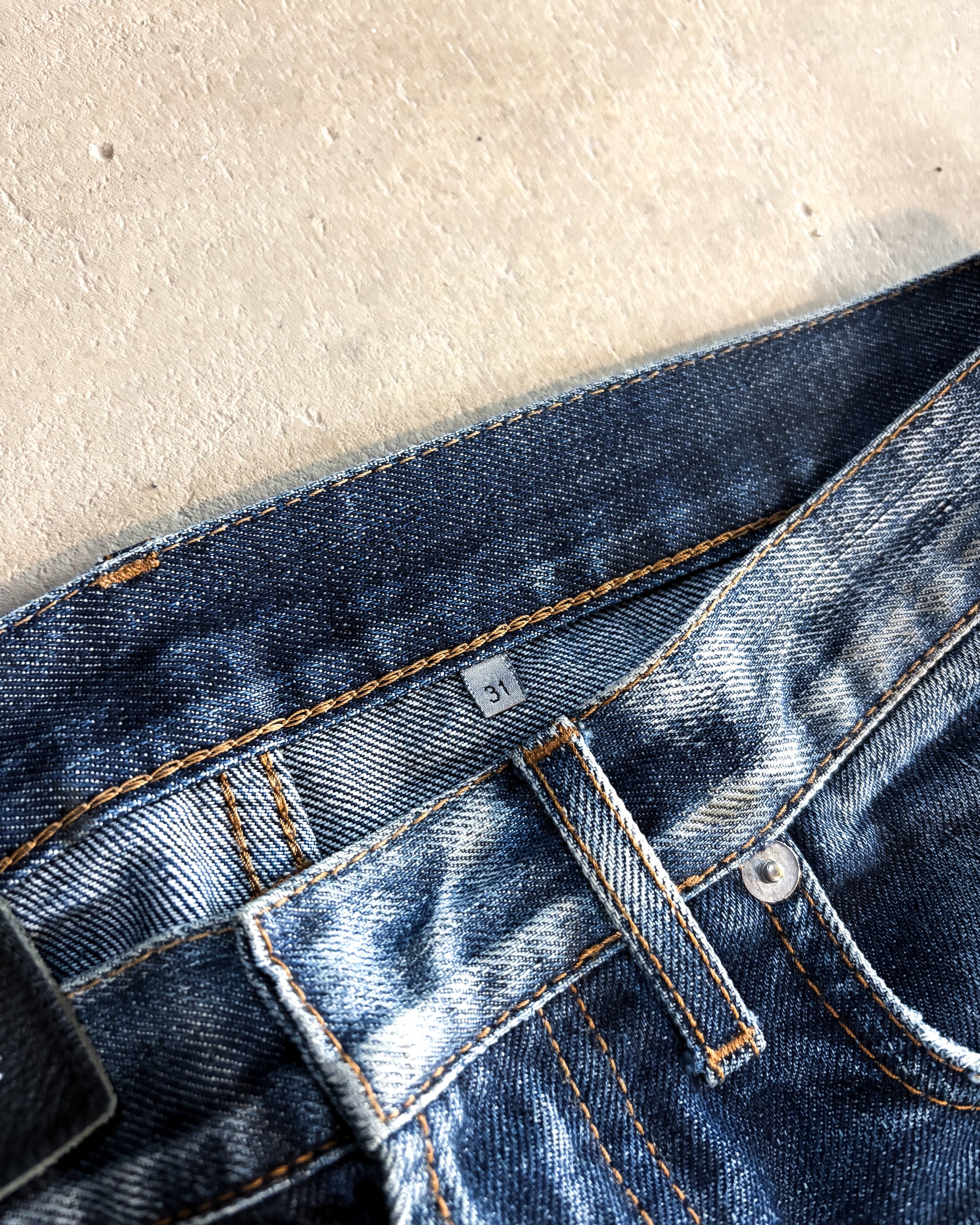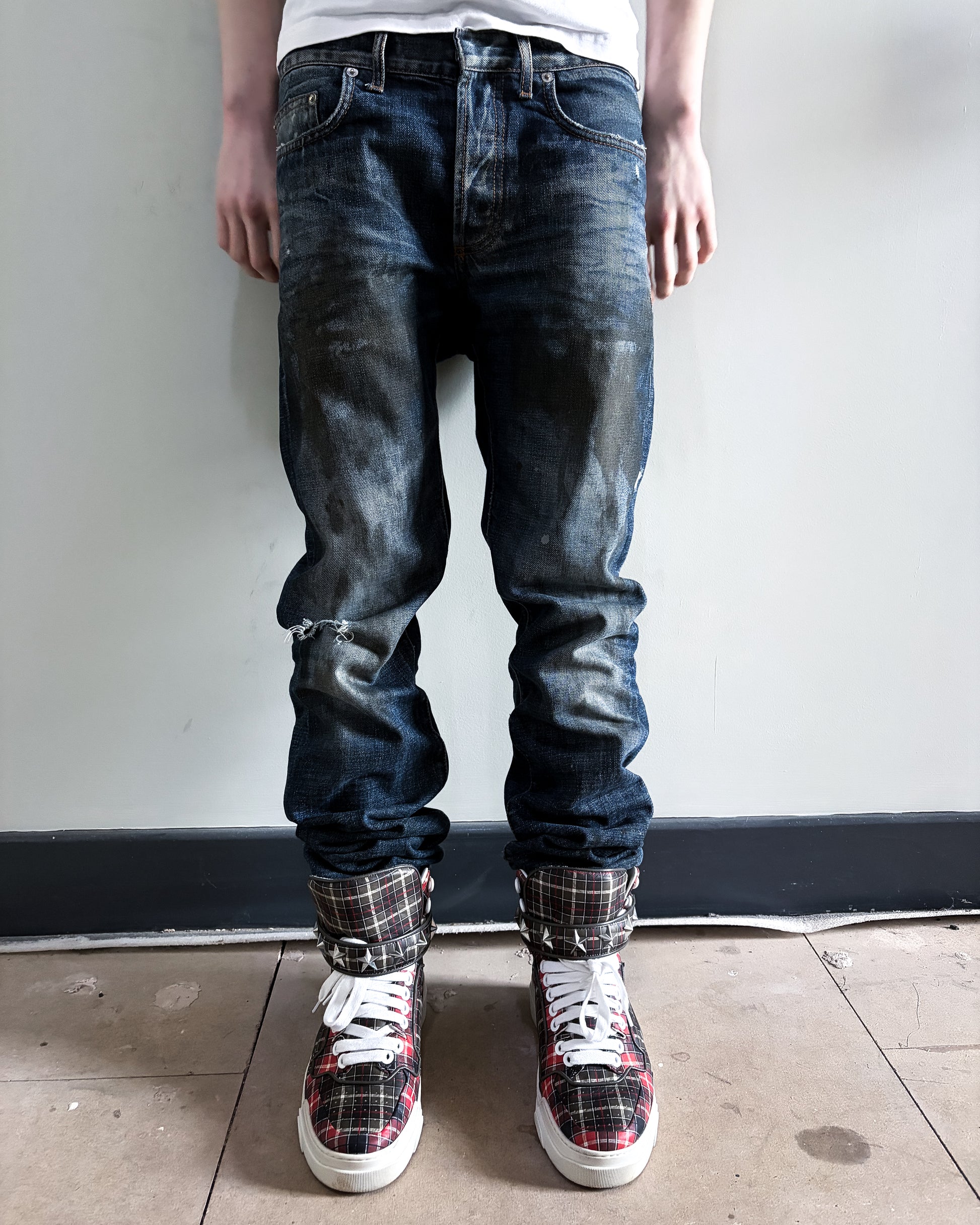 Dior Homme FW11 mud wash denim by Kris Van Assche, featuring the rack rail treatment seen throughout the collection. Crafted from Japanese denim with natural whiskering across the thighs and signature mud-effect distressing. Finished with an unaltered original inseam and classic Dior Homme slim silhouette.