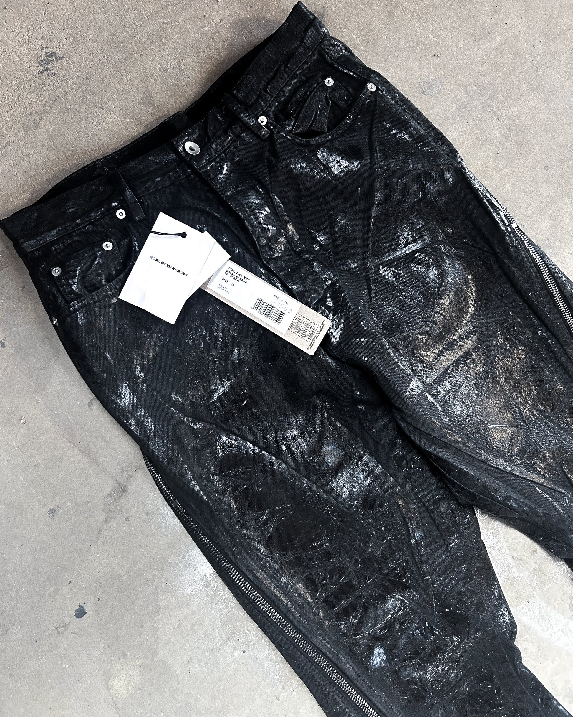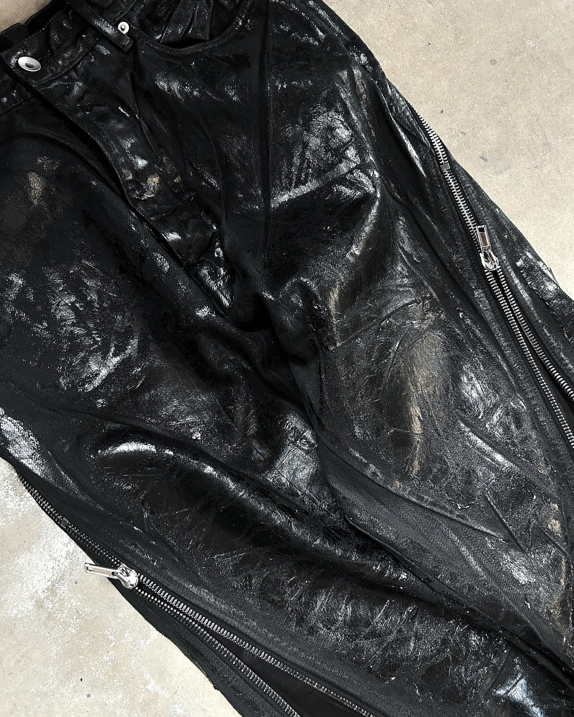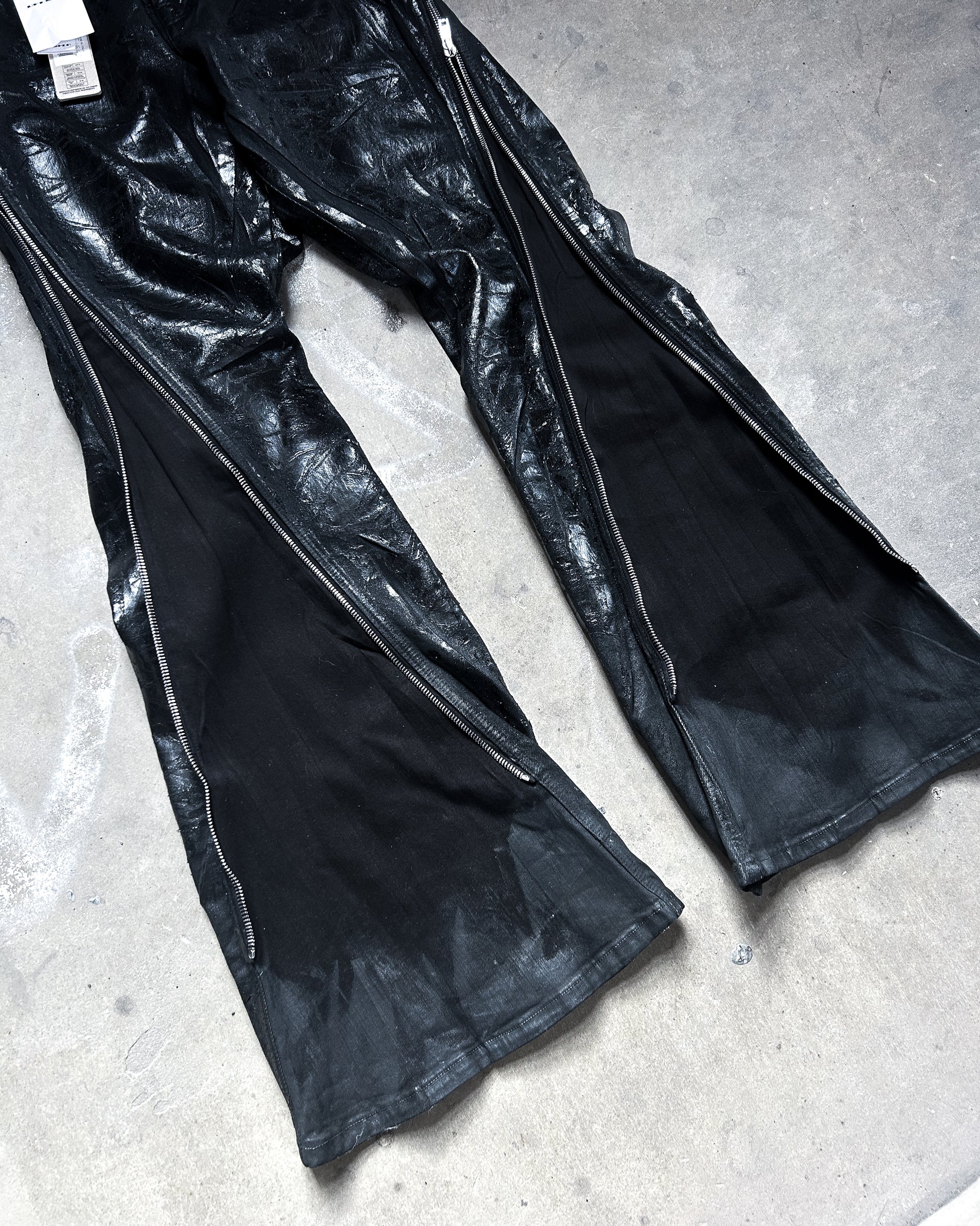For sale is one of the craziest pairs of denim to come from Rick Owens, a pair of megacrust Japanese denim Bolans. This pair is overdyed black, then treated with wax and several layers of black foil, then a final wash makes the foil peel and crack. Insane pair, almost $2k retail for a reason.