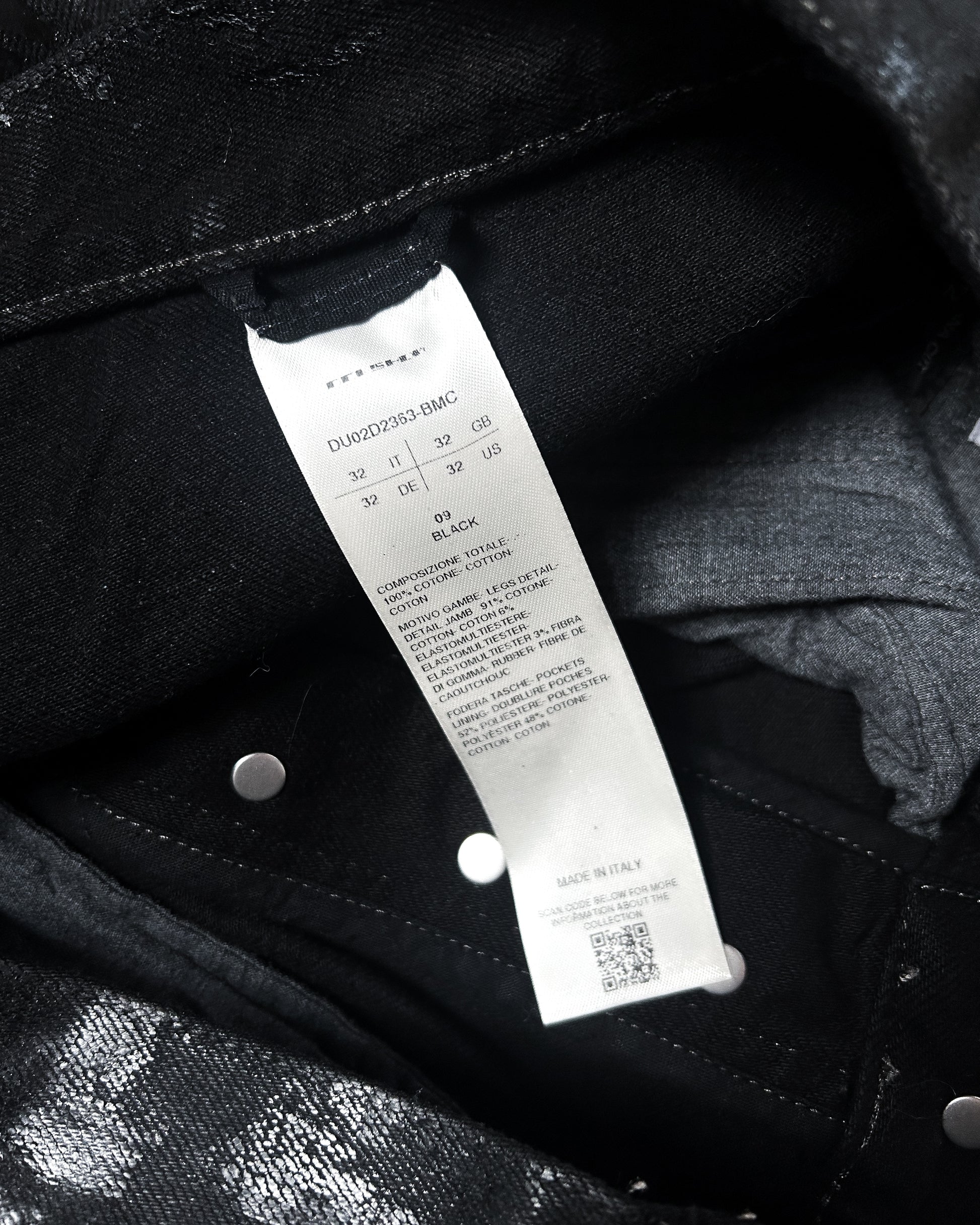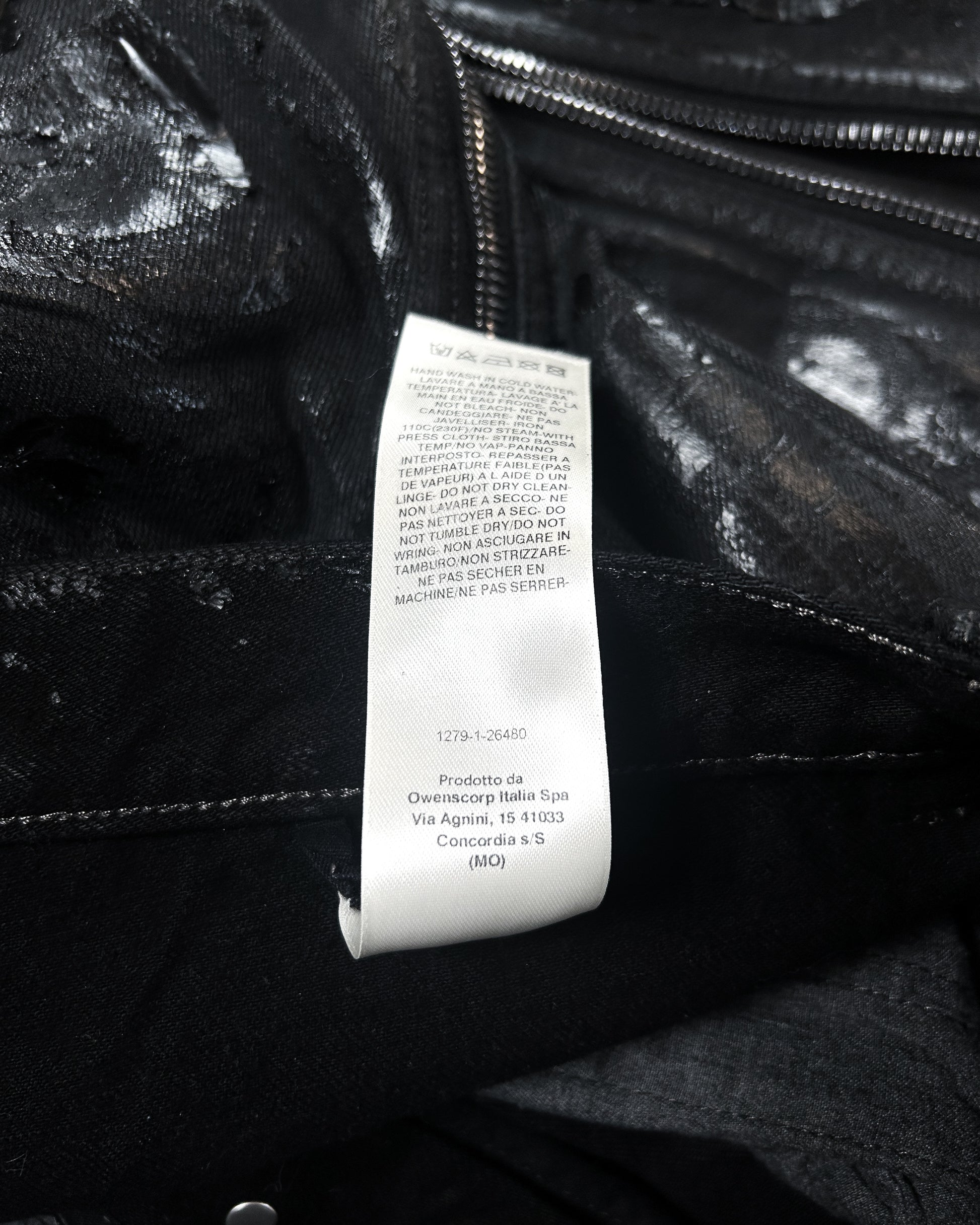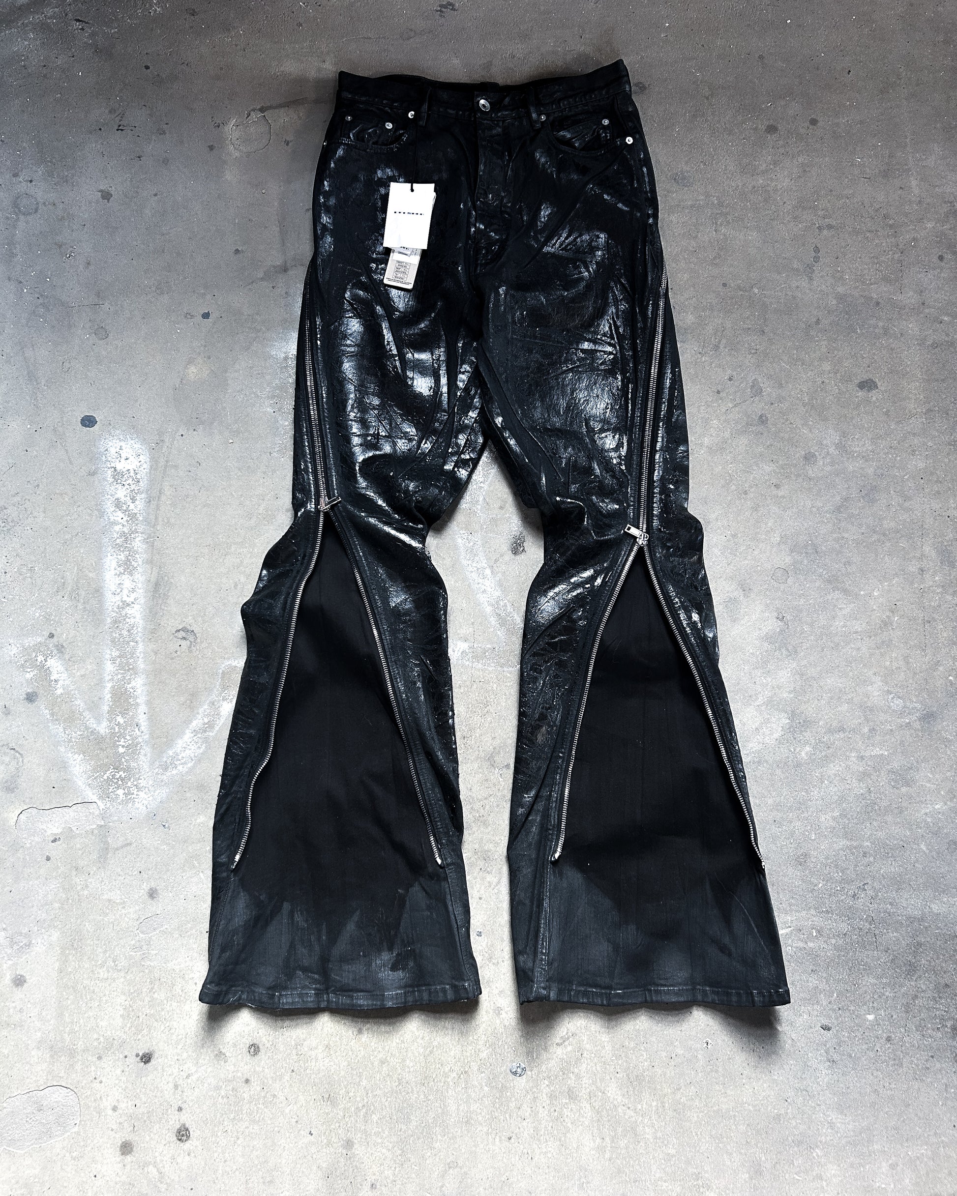 For sale is one of the craziest pairs of denim to come from Rick Owens, a pair of megacrust Japanese denim Bolans. This pair is overdyed black, then treated with wax and several layers of black foil, then a final wash makes the foil peel and crack. Insane pair, almost $2k retail for a reason.