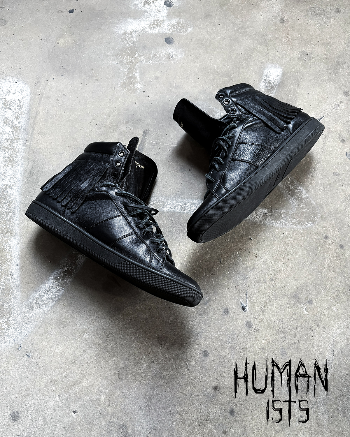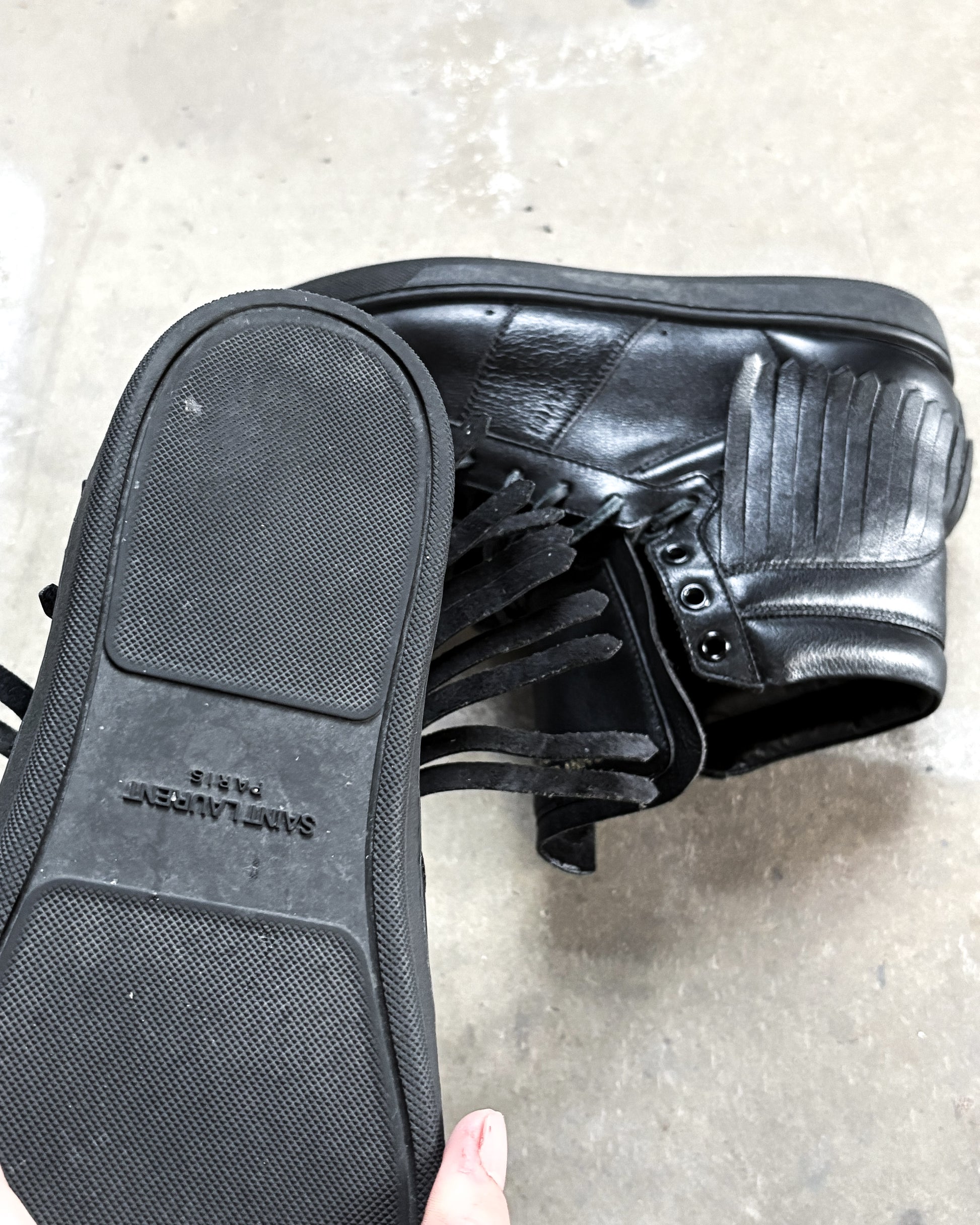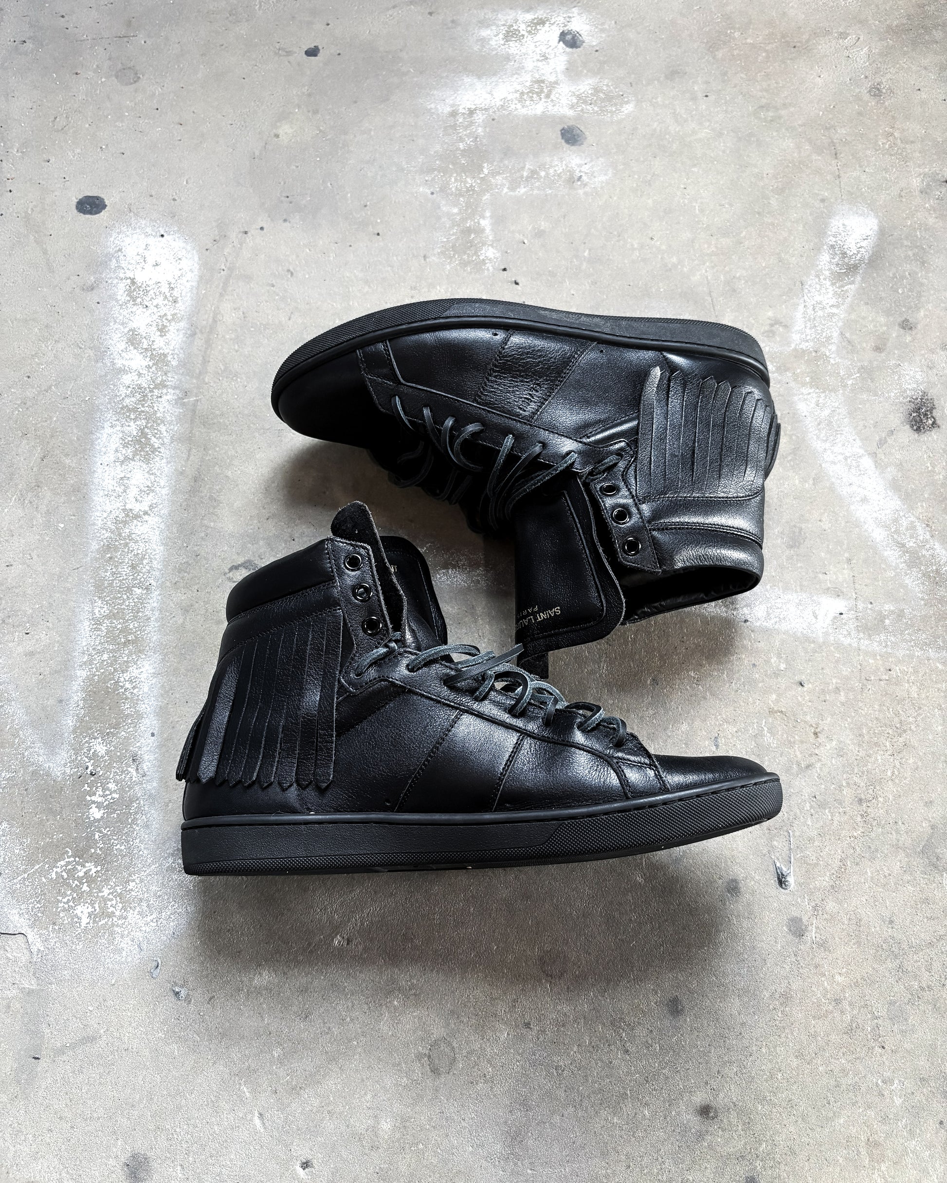 For sale is a pair of Hedi Slimane era Saint Laurent Paris leather high tops. Features an amazing fringe effect around the heels perfect for any dior or saint laurent jeans.