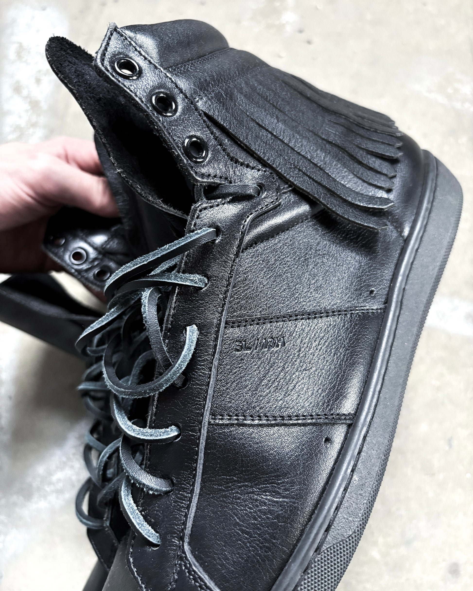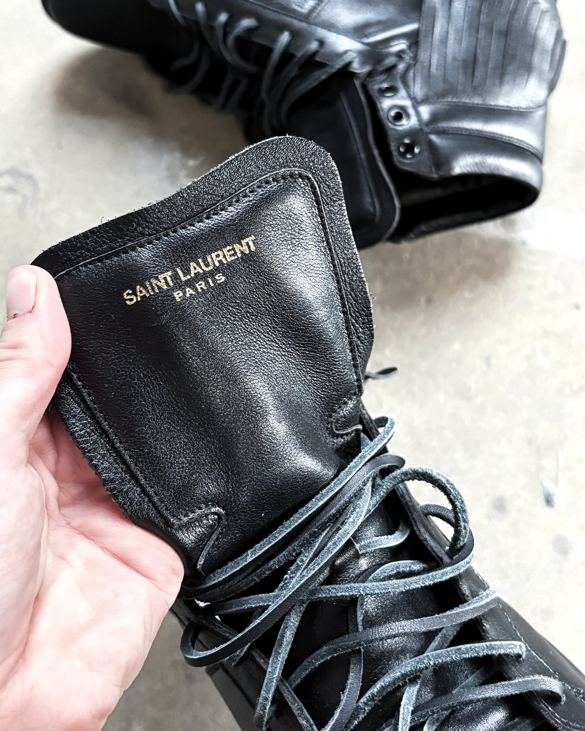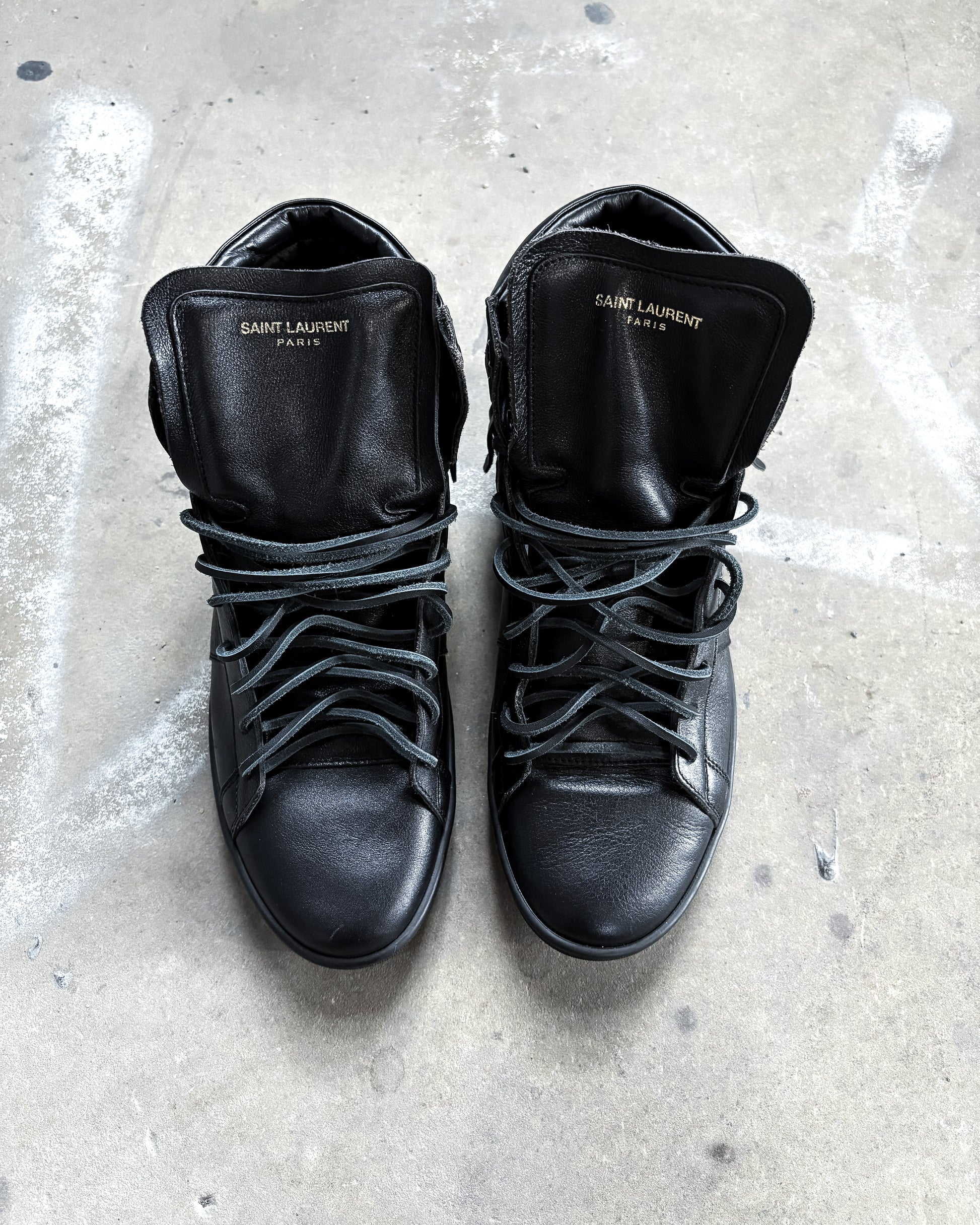 For sale is a pair of Hedi Slimane era Saint Laurent Paris leather high tops. Features an amazing fringe effect around the heels perfect for any dior or saint laurent jeans.