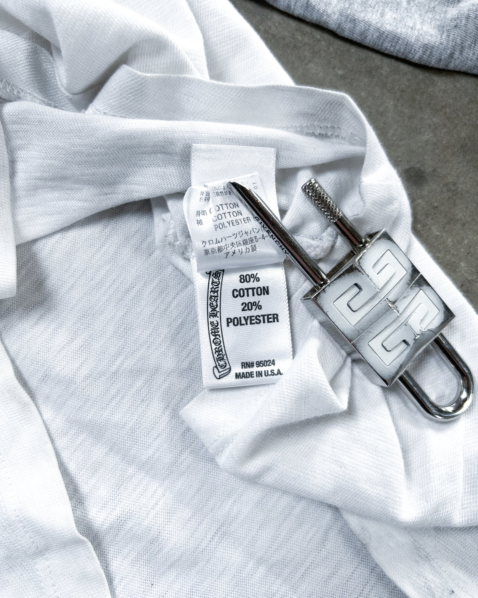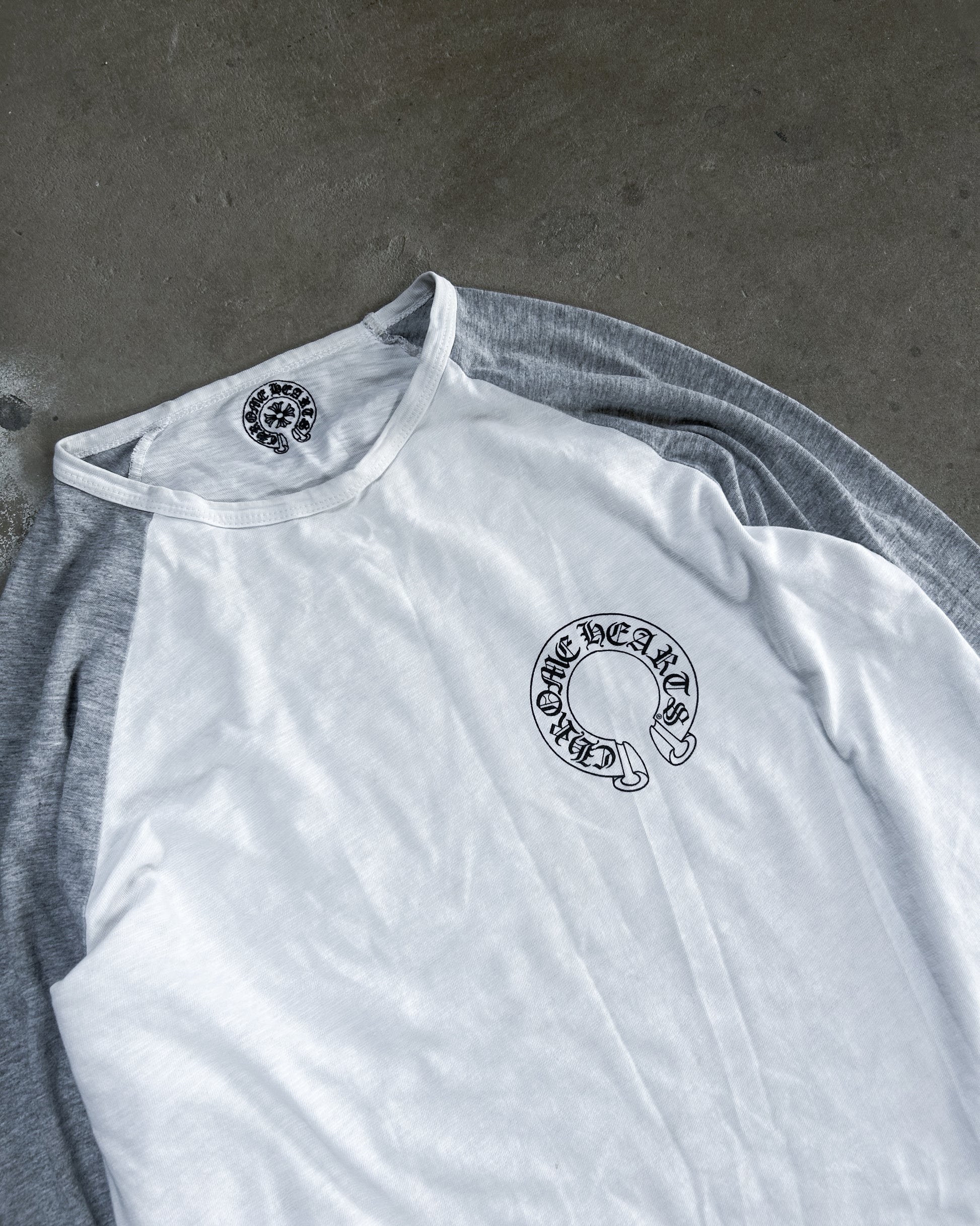 For sale is a Chrome Hearts raglan longsleeve featuring horseshoe logo on front and scroll logo printed on back.