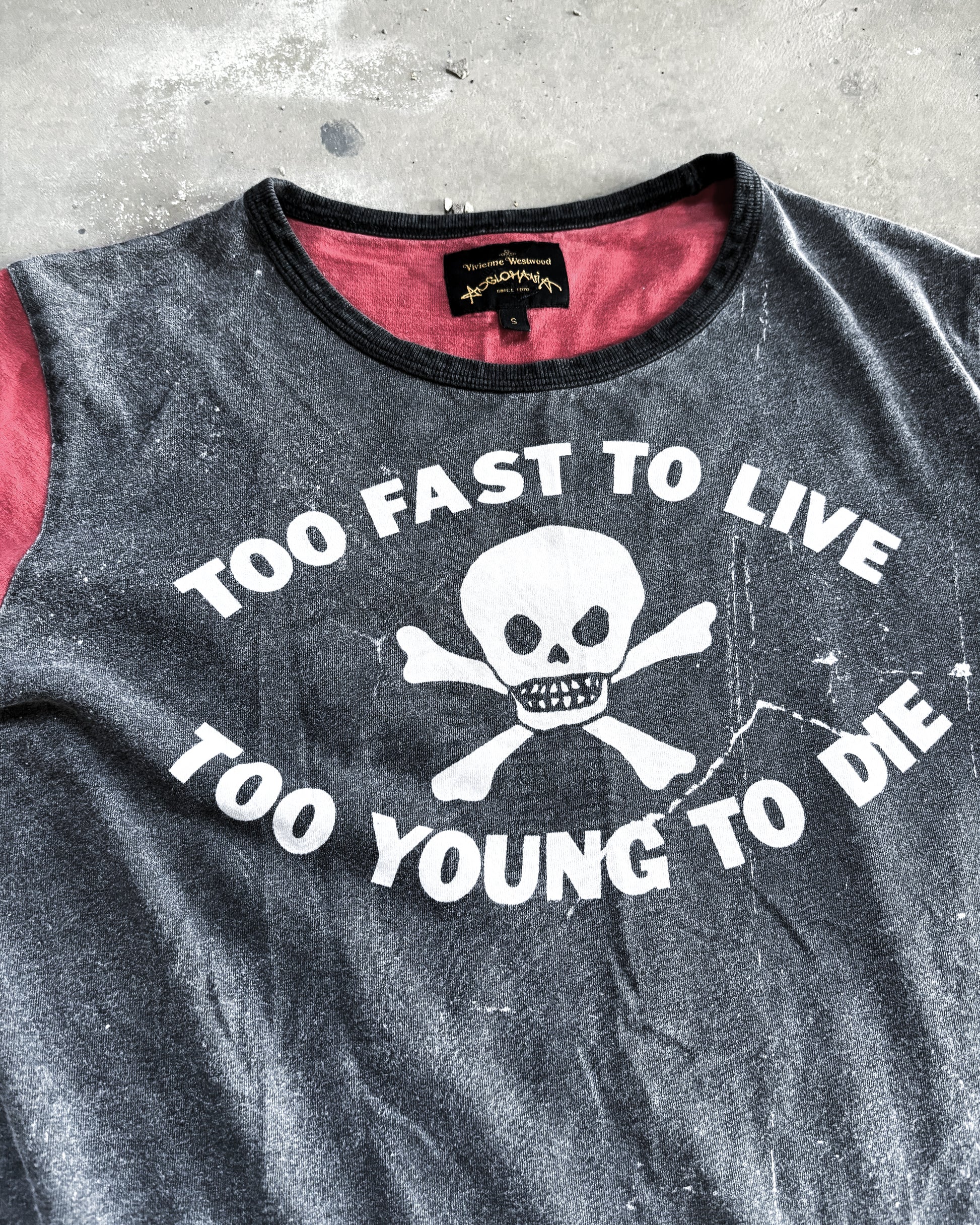 For sale is a Vivienne Westwood grail t-shirt featuring the ‘Too Fast To Live, Too Young To Die’ print.