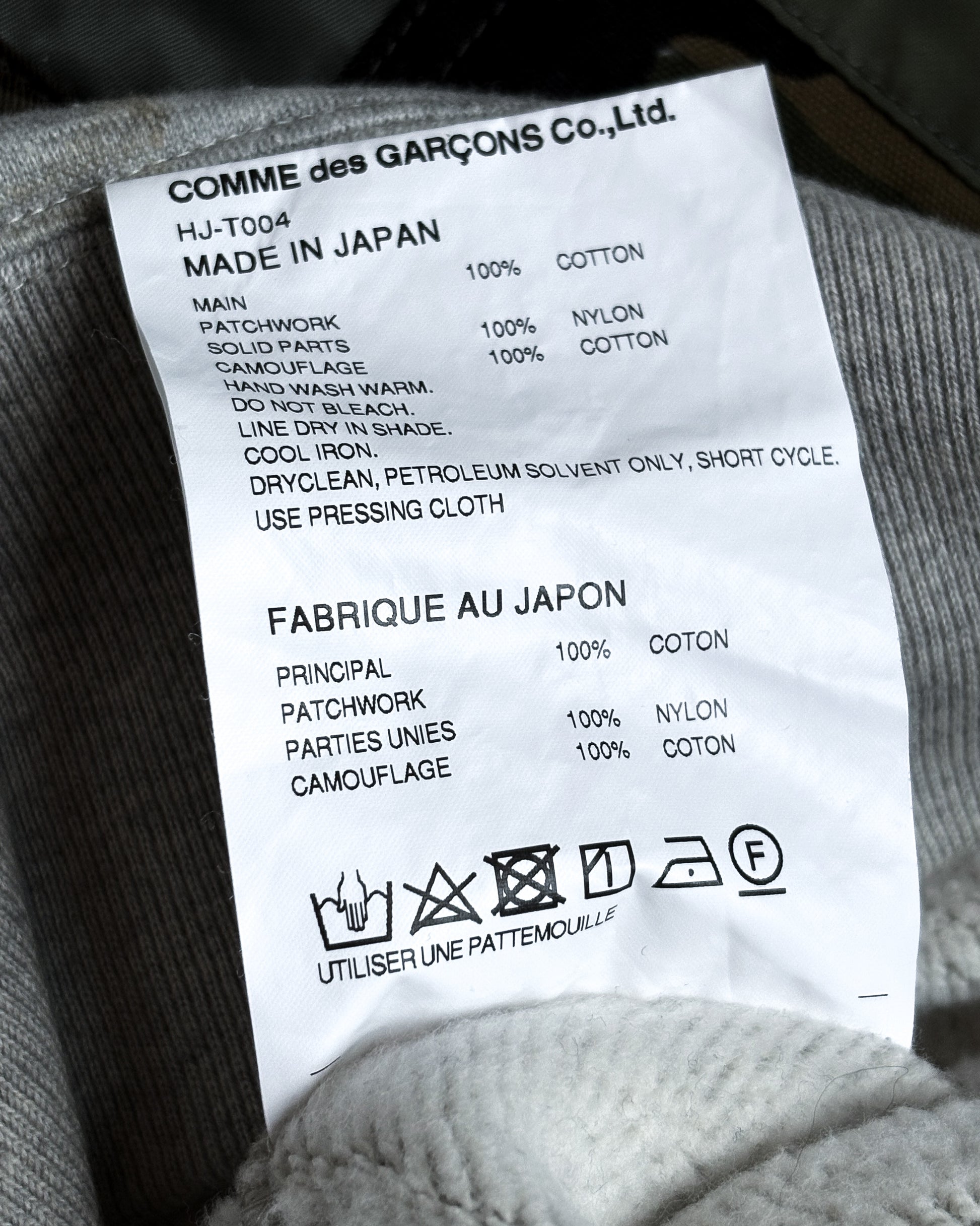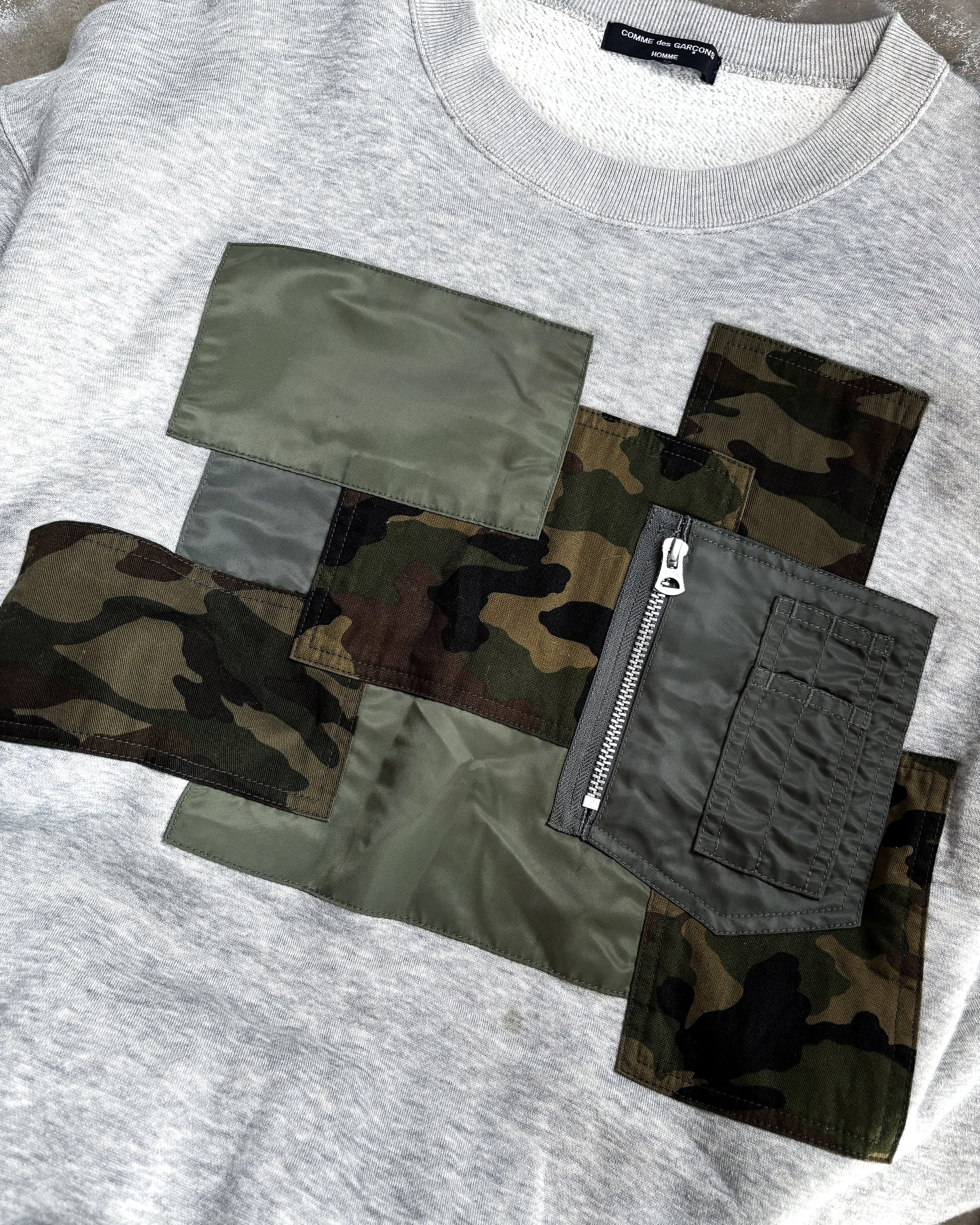For sale is a Comme Des Garçons homme sweater featuring different textile patches in green and camo with a front pocket.