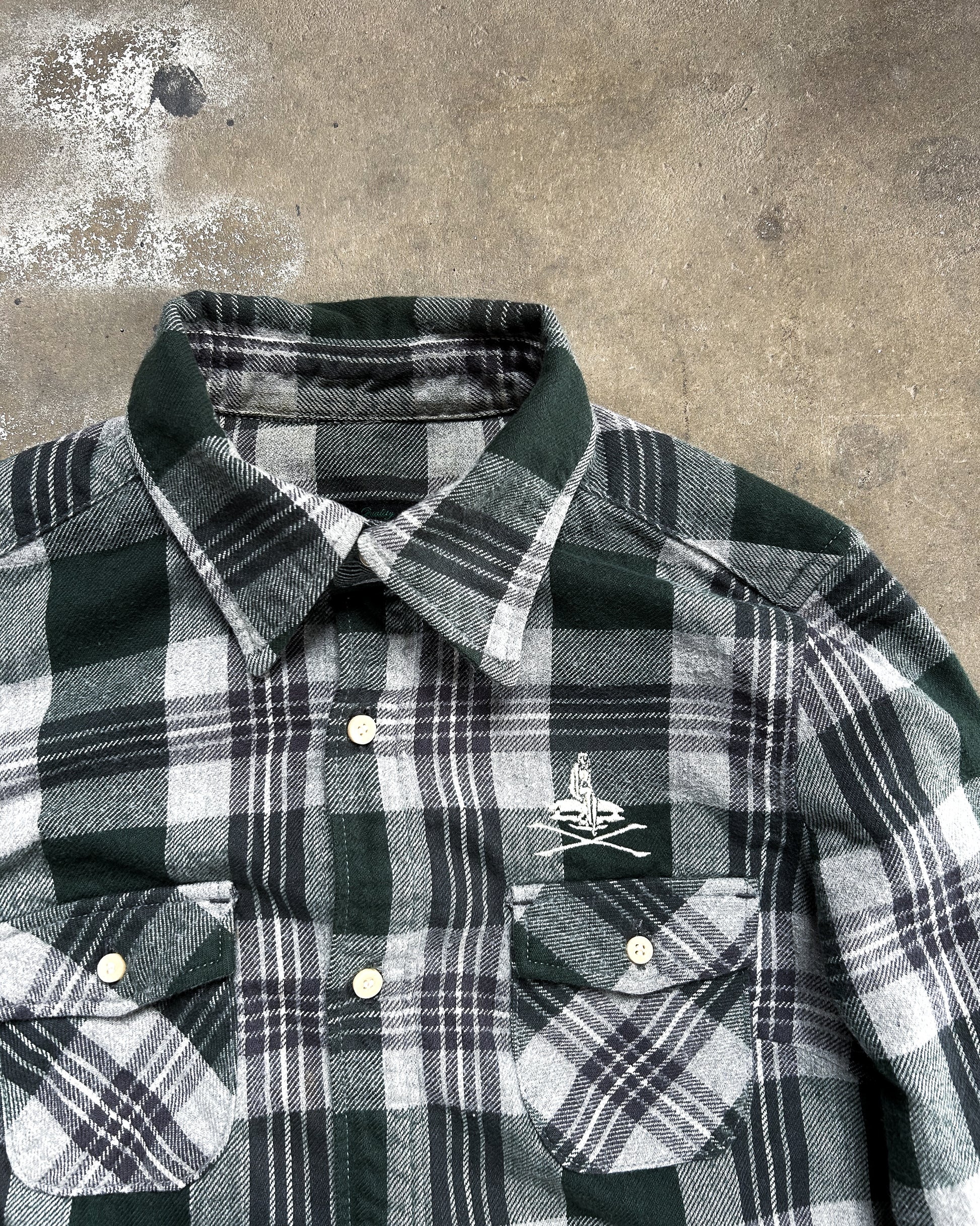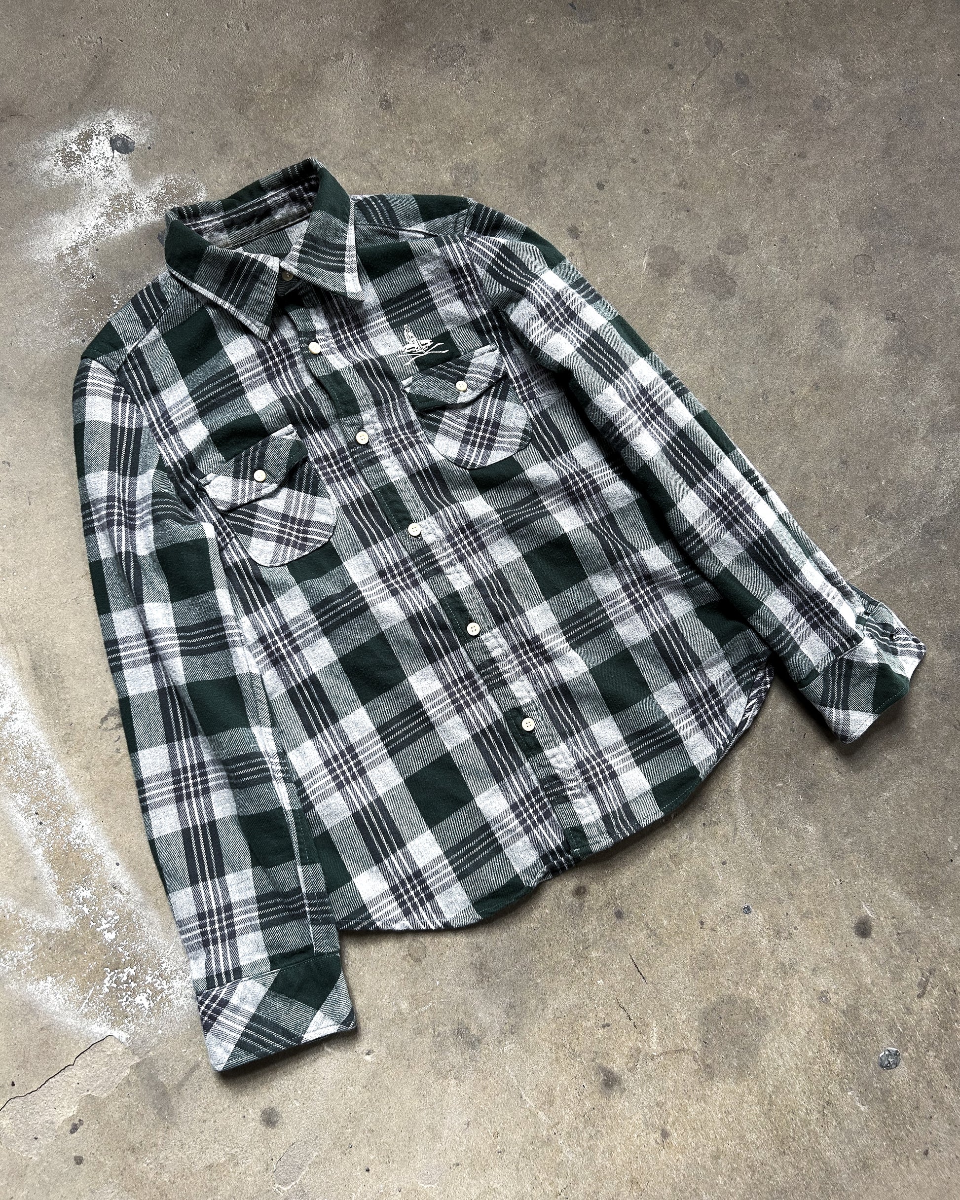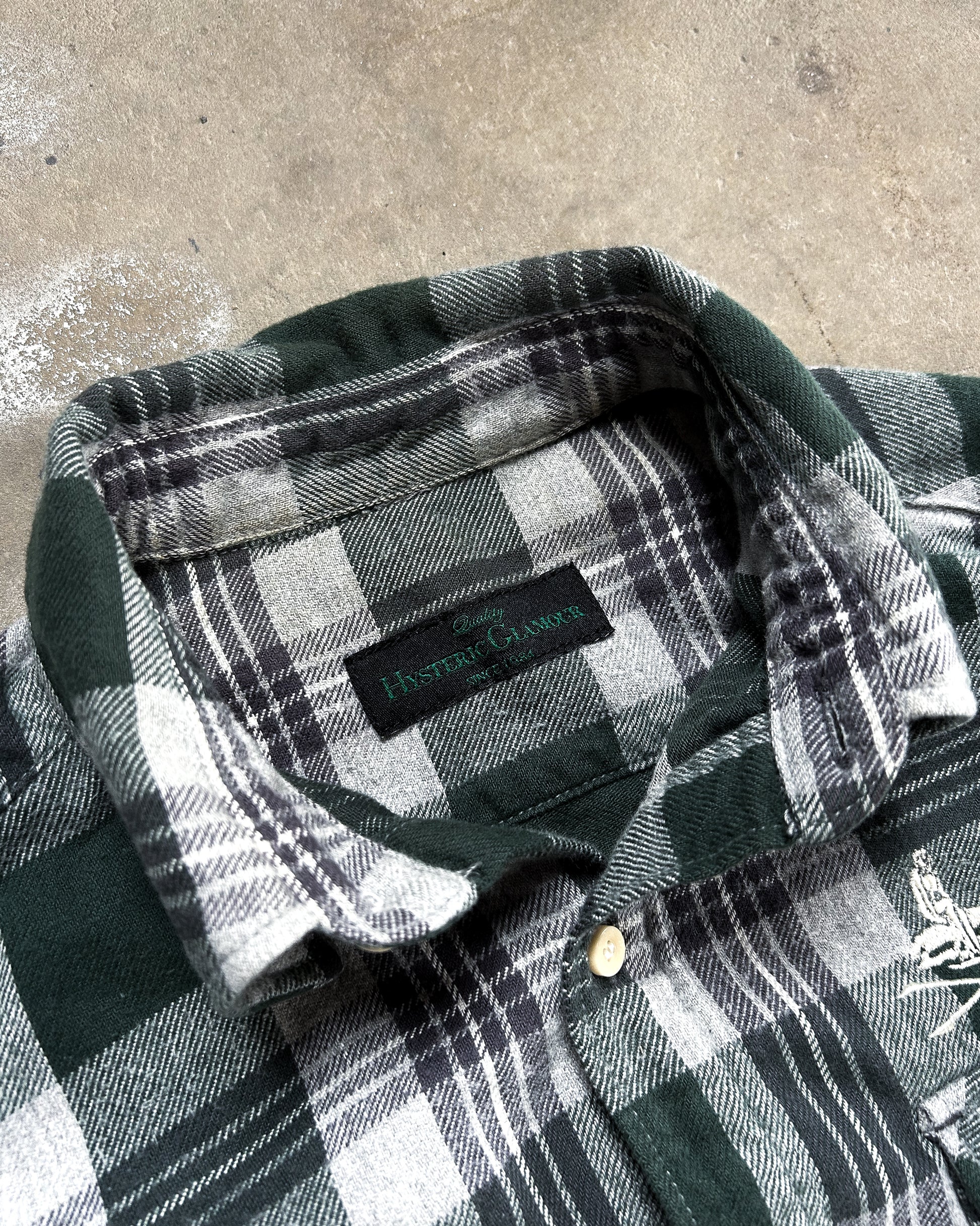 For sale is a Hysteric Glamour, made in Japan, flannel in Green and monochrome with a skull and crossbones embroidered with a woman sat on top.