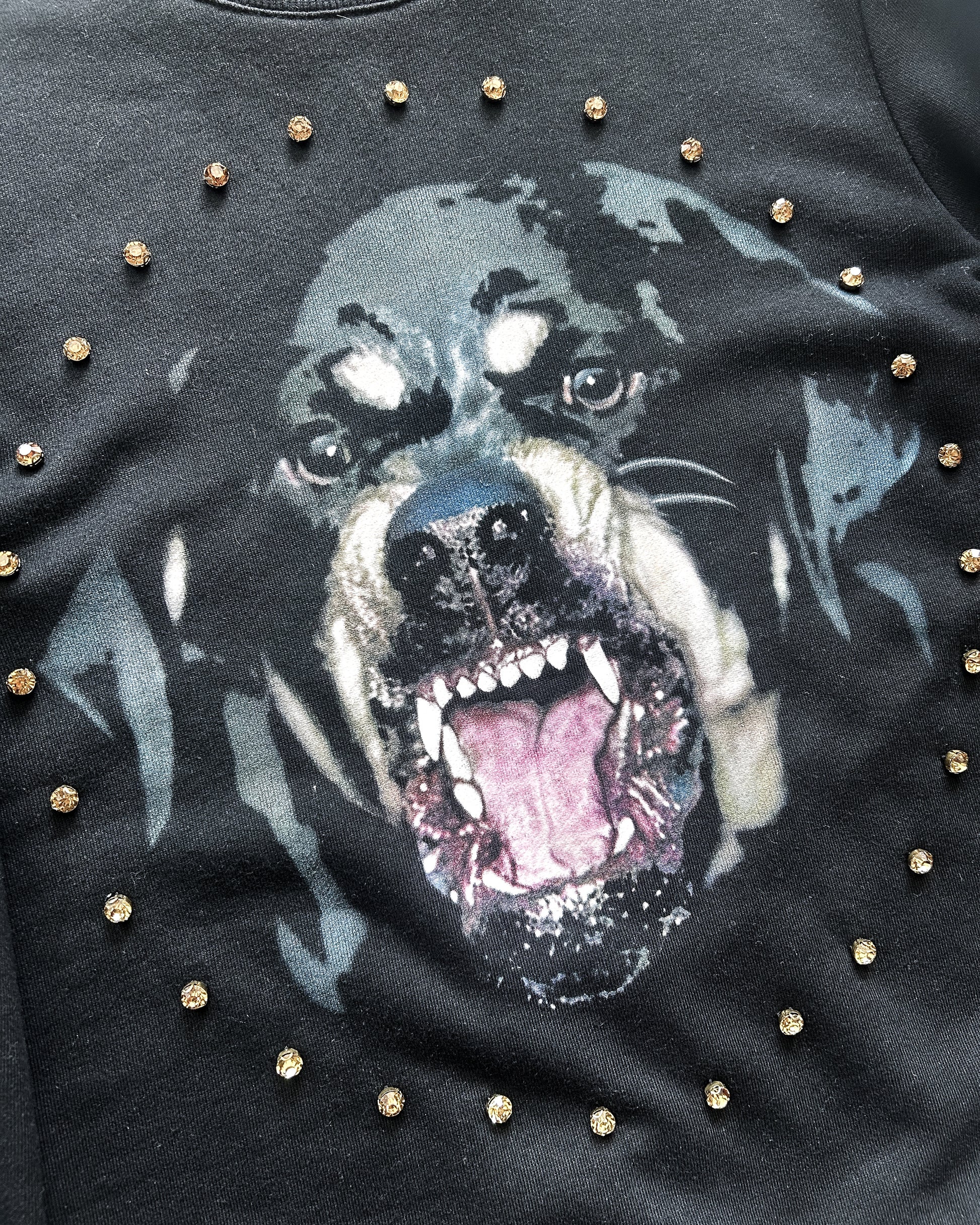 For sale is a Givenchy Spring Summer 2012 sweatshirt by Ricardo Tisci. This is one of the first rottweilers designs with gold diamonds surrounding the print.