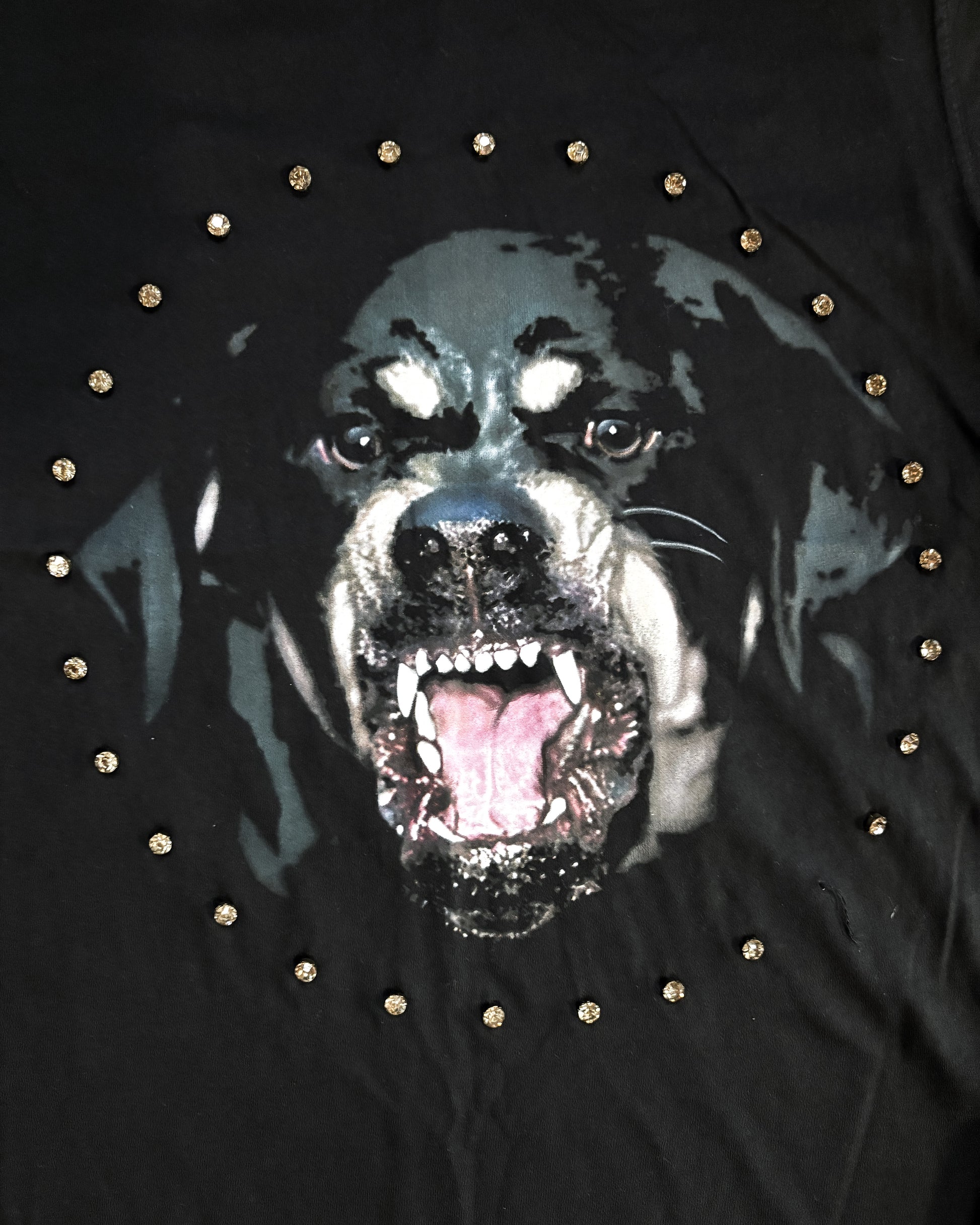 For sale is a Ricardo Tisci rottweiler design with gold gems surrounding it from Spring 2012. Good Tisci.