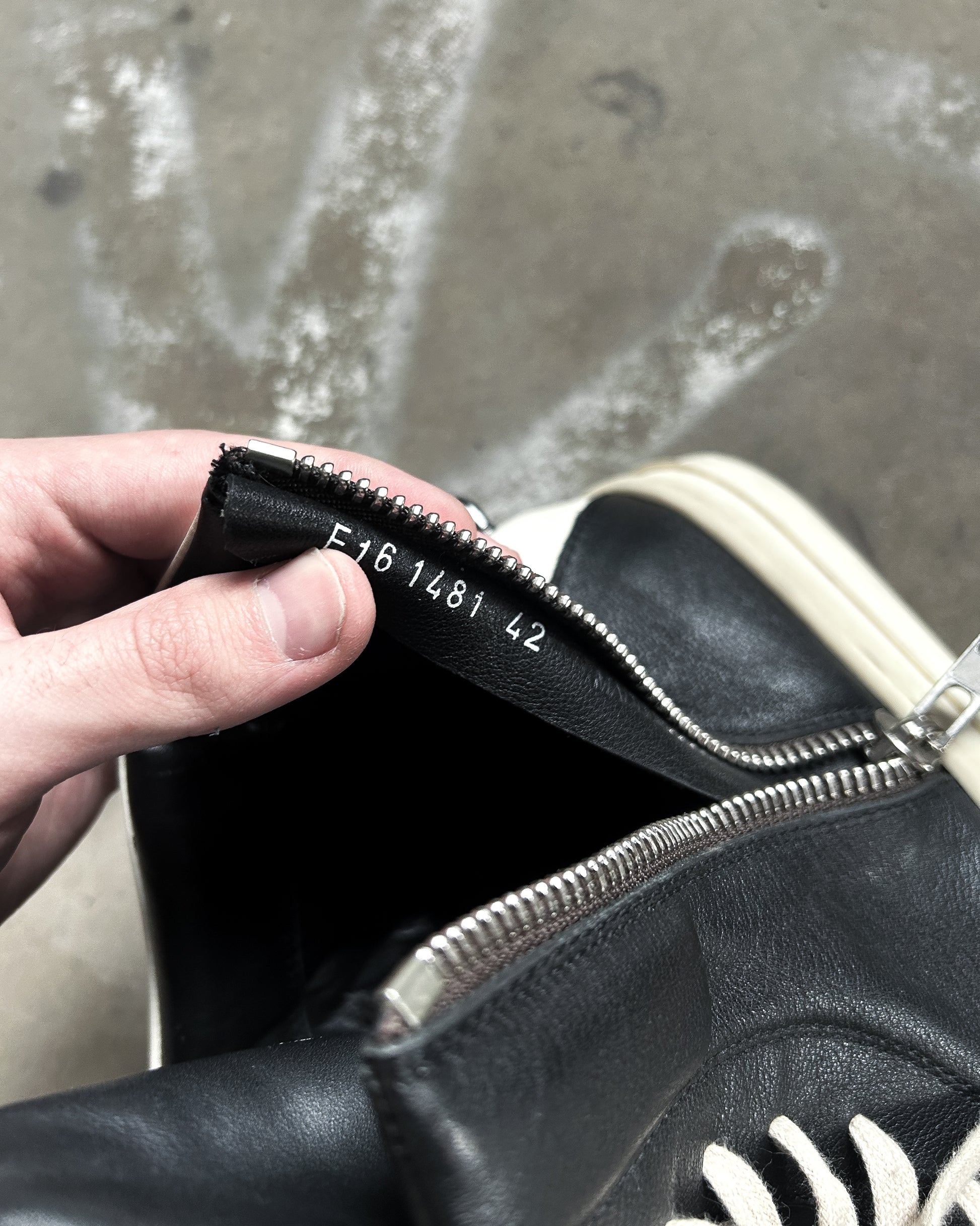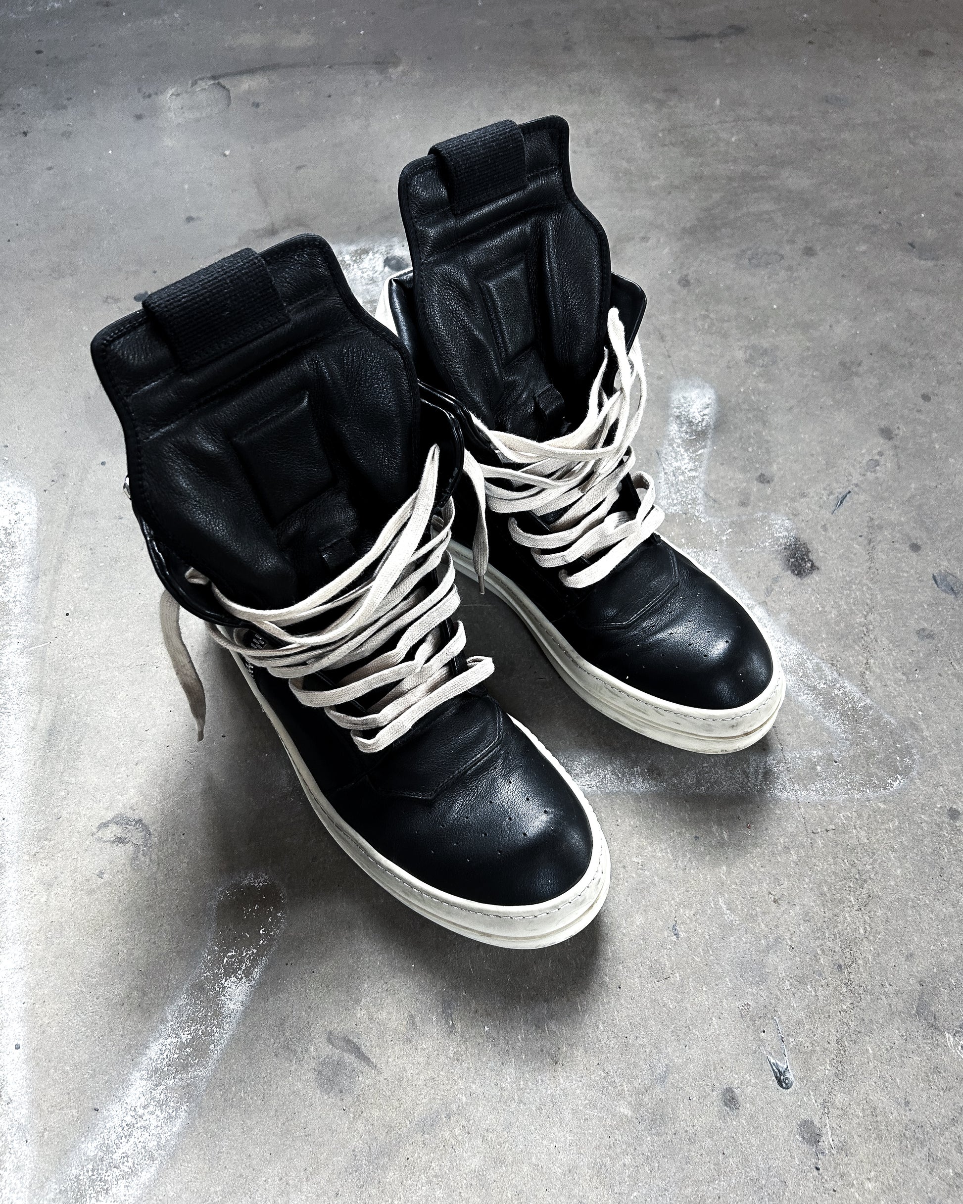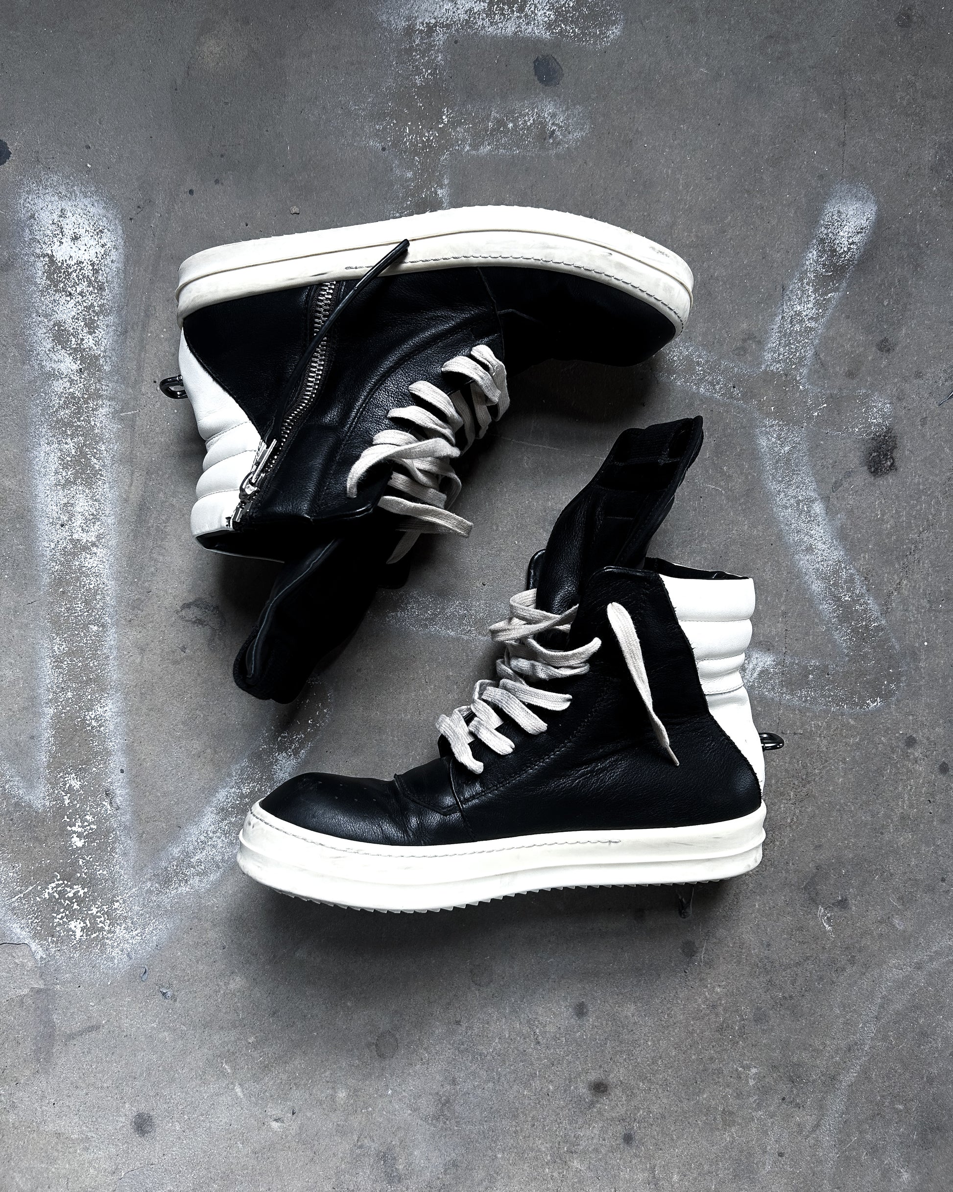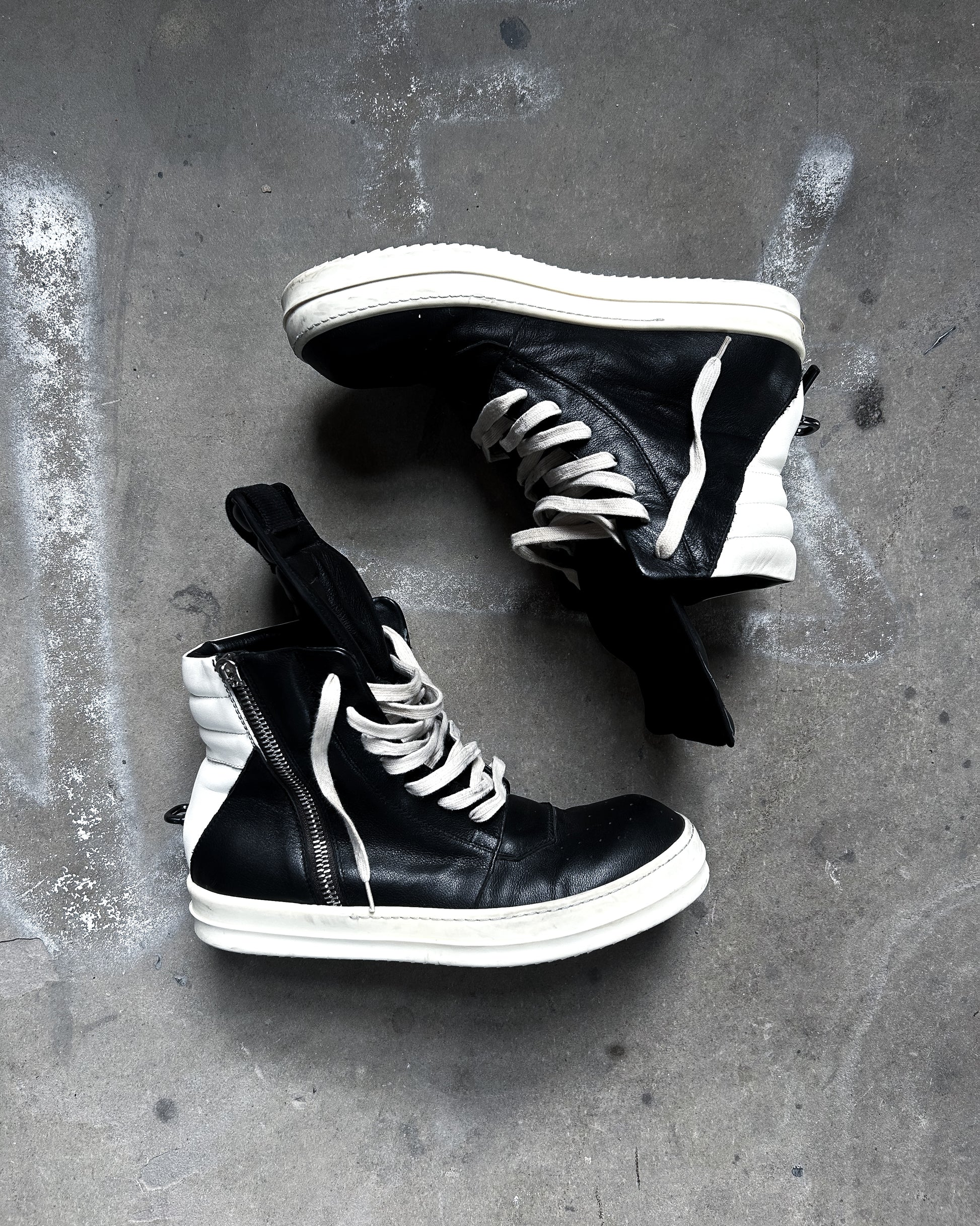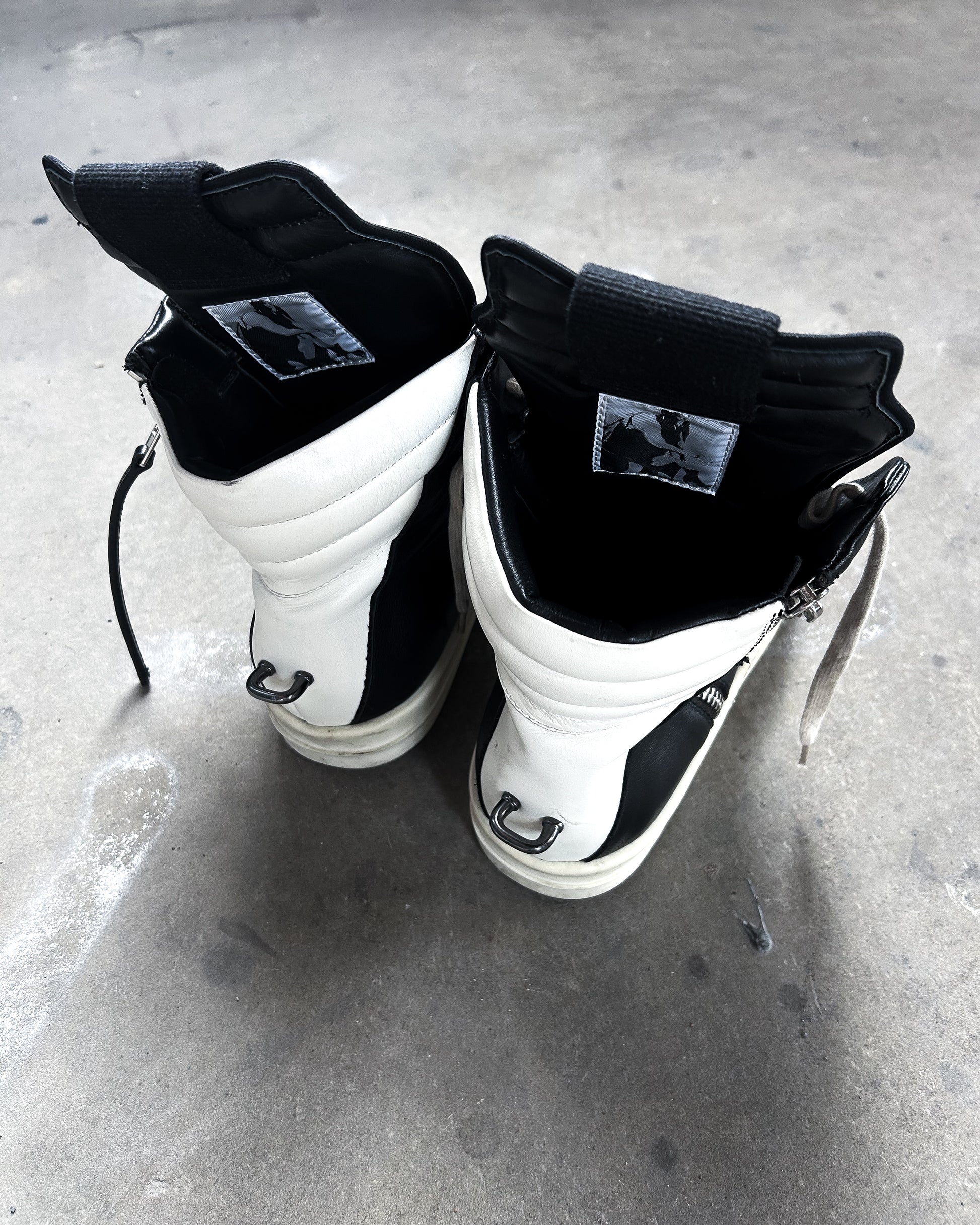 Rick Owens Spring Summer 2016 'Cyclops' geobaskets featuring calf leather attachment on one zipper. Slightly different design to the newer versions this version features less milk colour with hooks on the back.