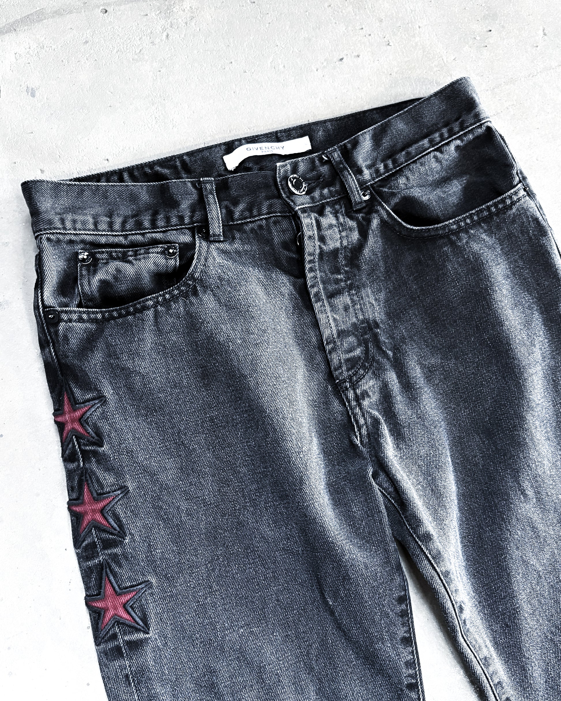 For sale is a pair of Ricardo Tisci Givenchy denim jeans featuring 3 embroidered star motifs down the hem. Slim fitting 5 pocket design.