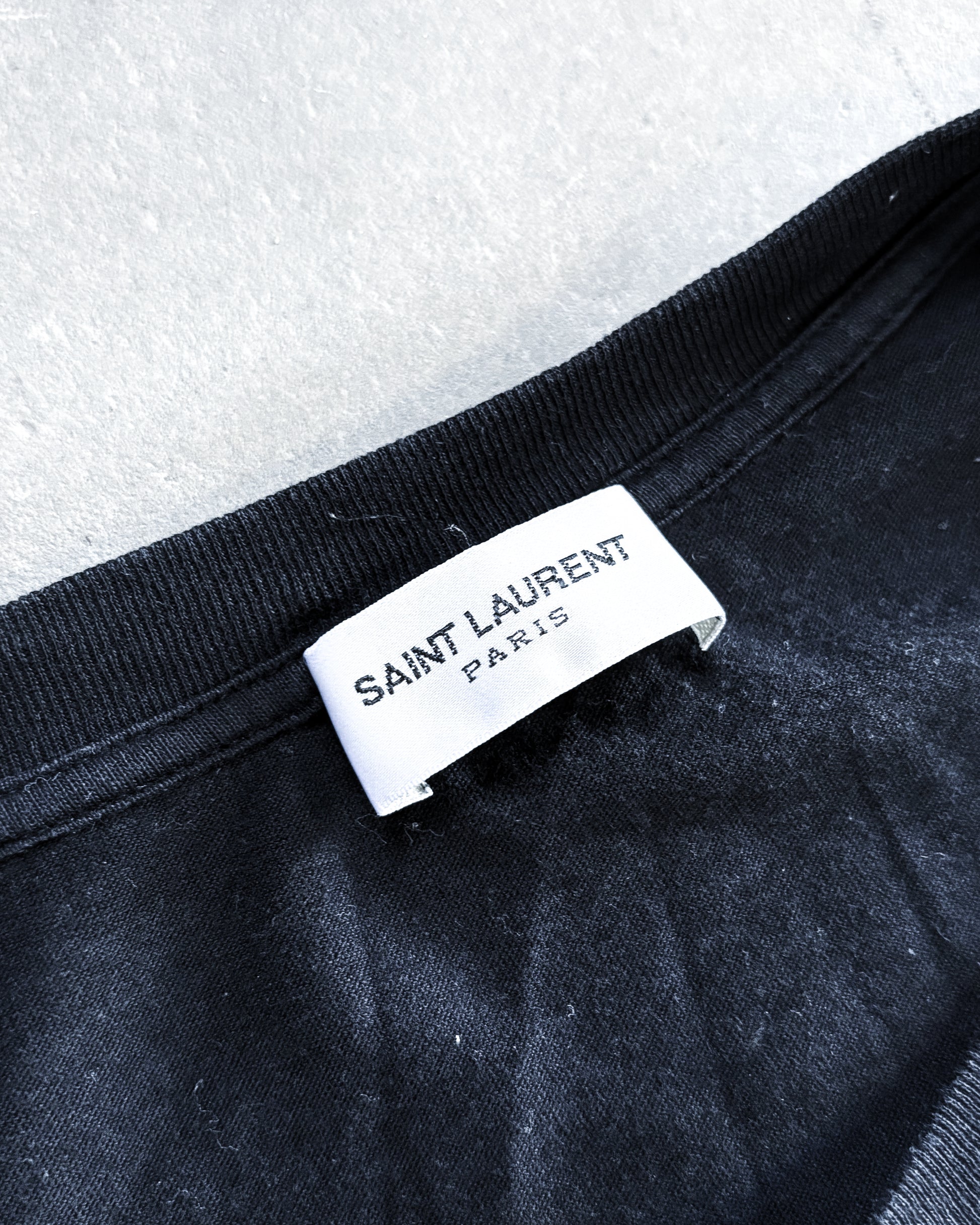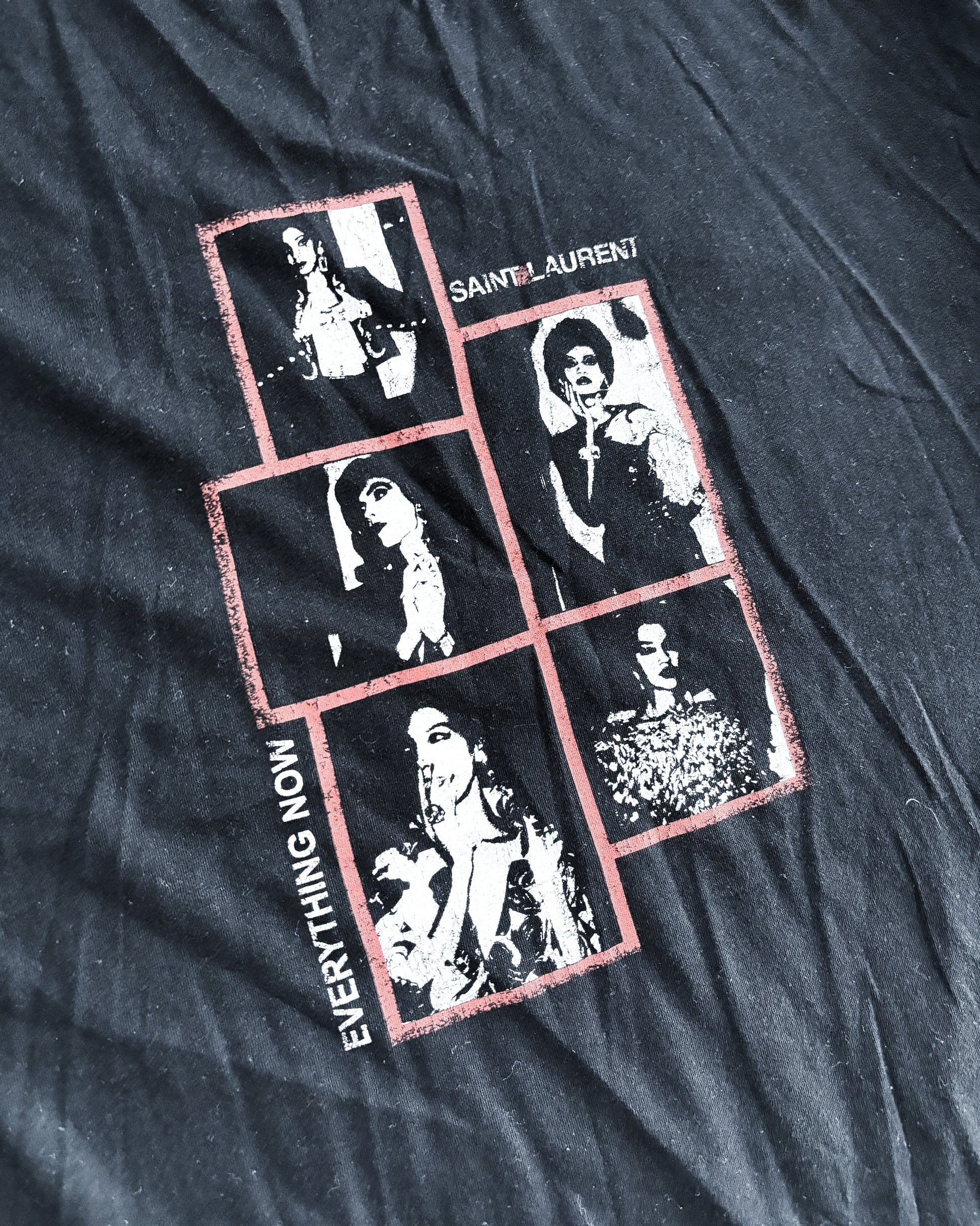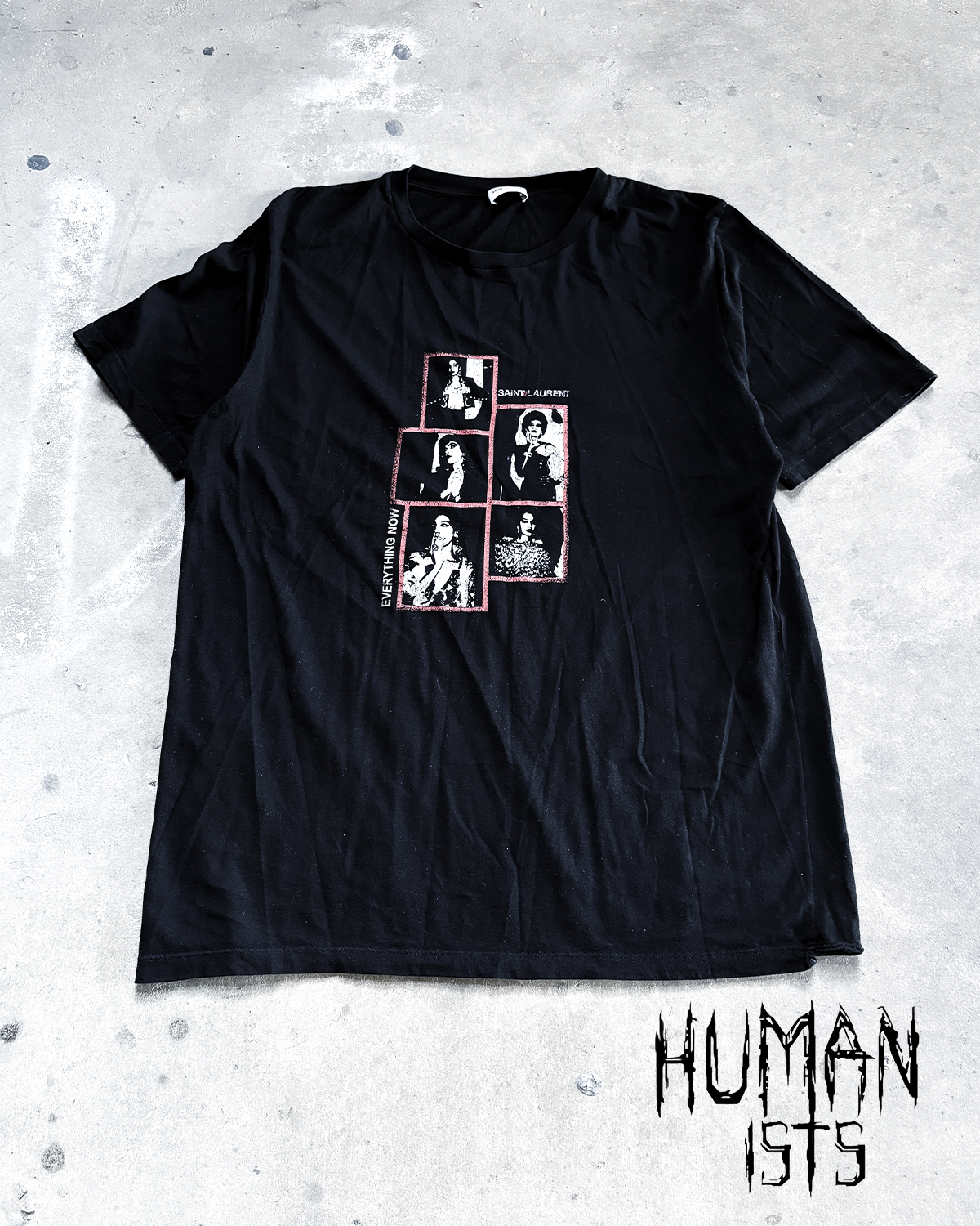 For sale is a Saint Laurent t-shirt by Anthony Vaccarello featuring a red and monochrome print featuring ‘everything now’ slogan.