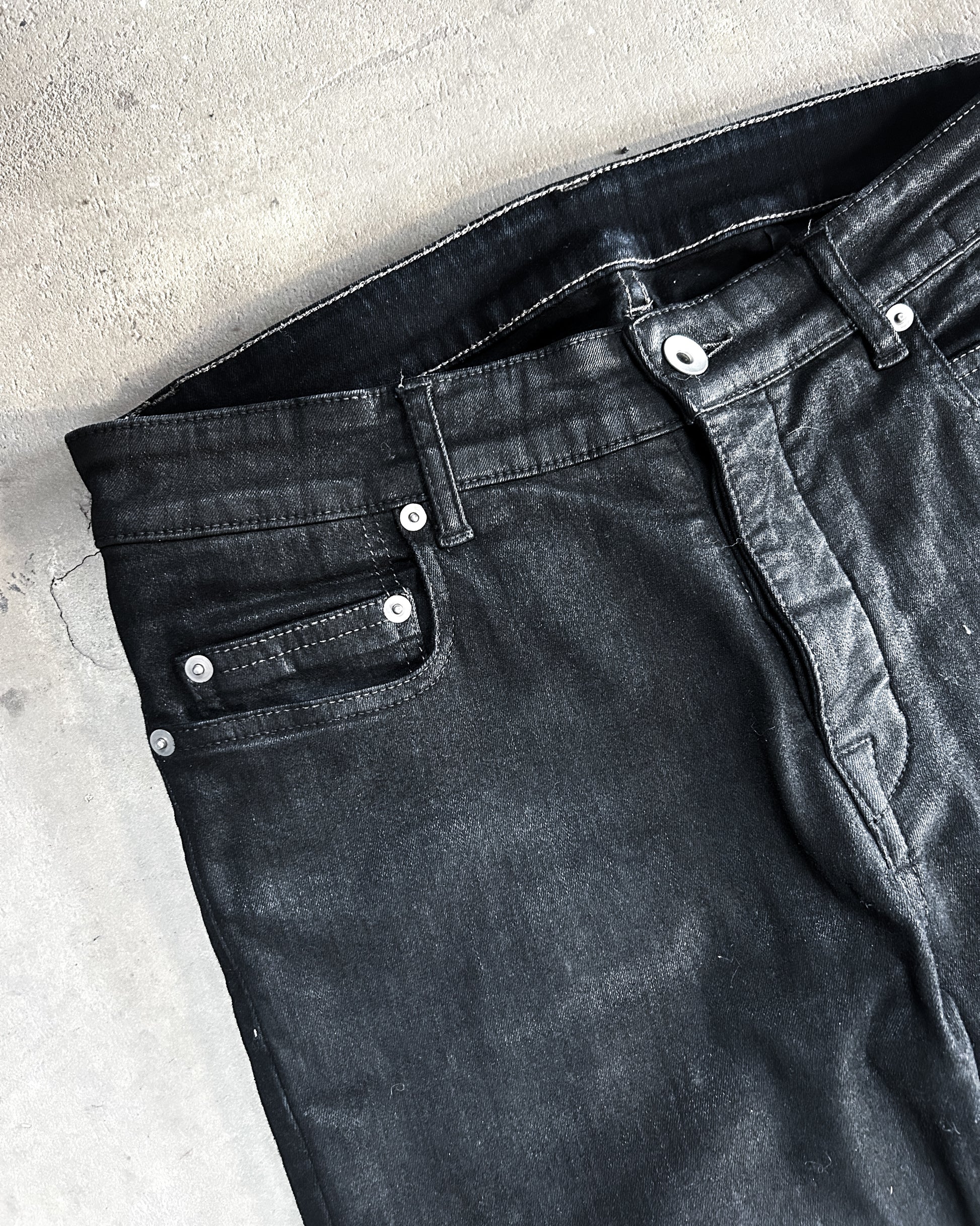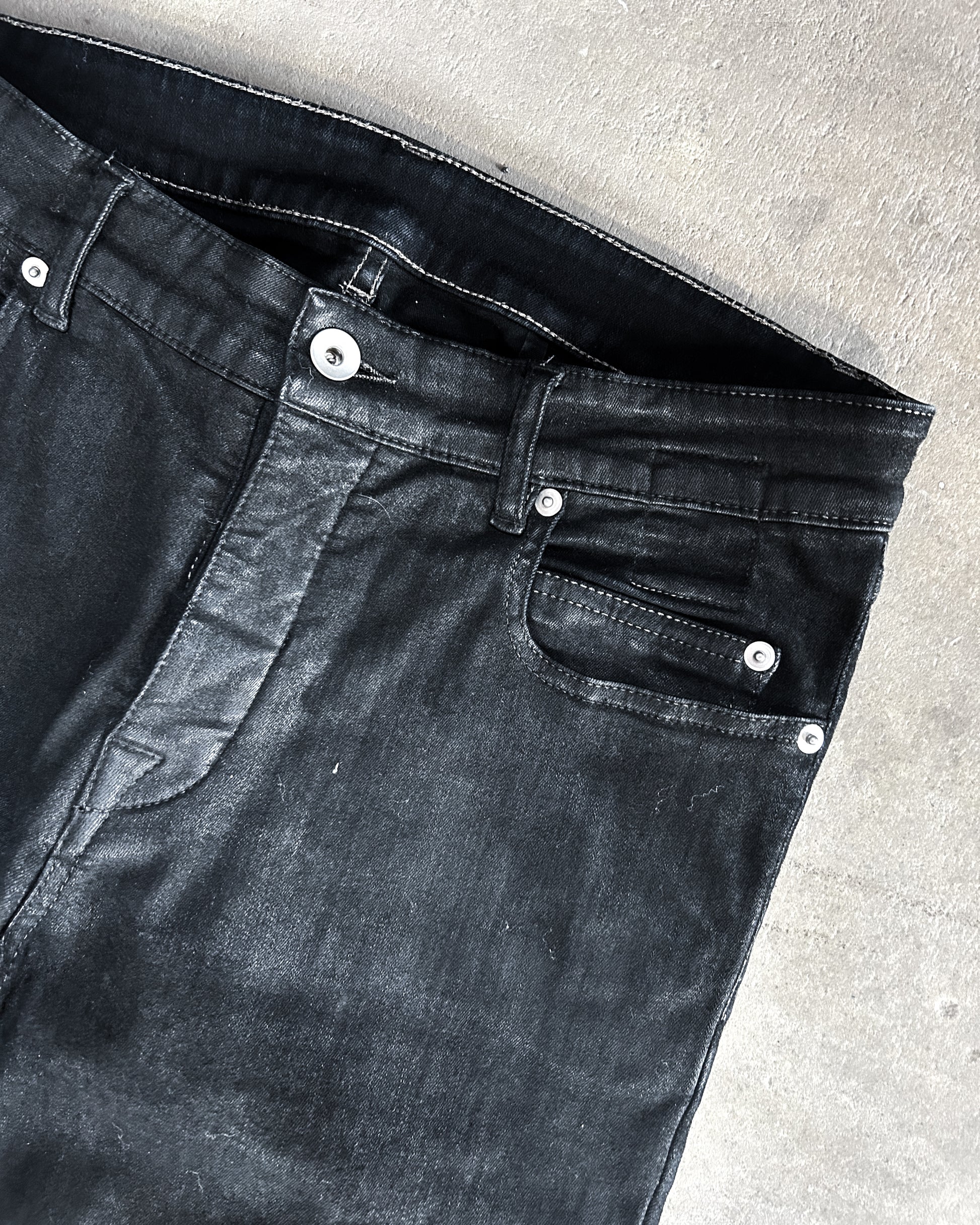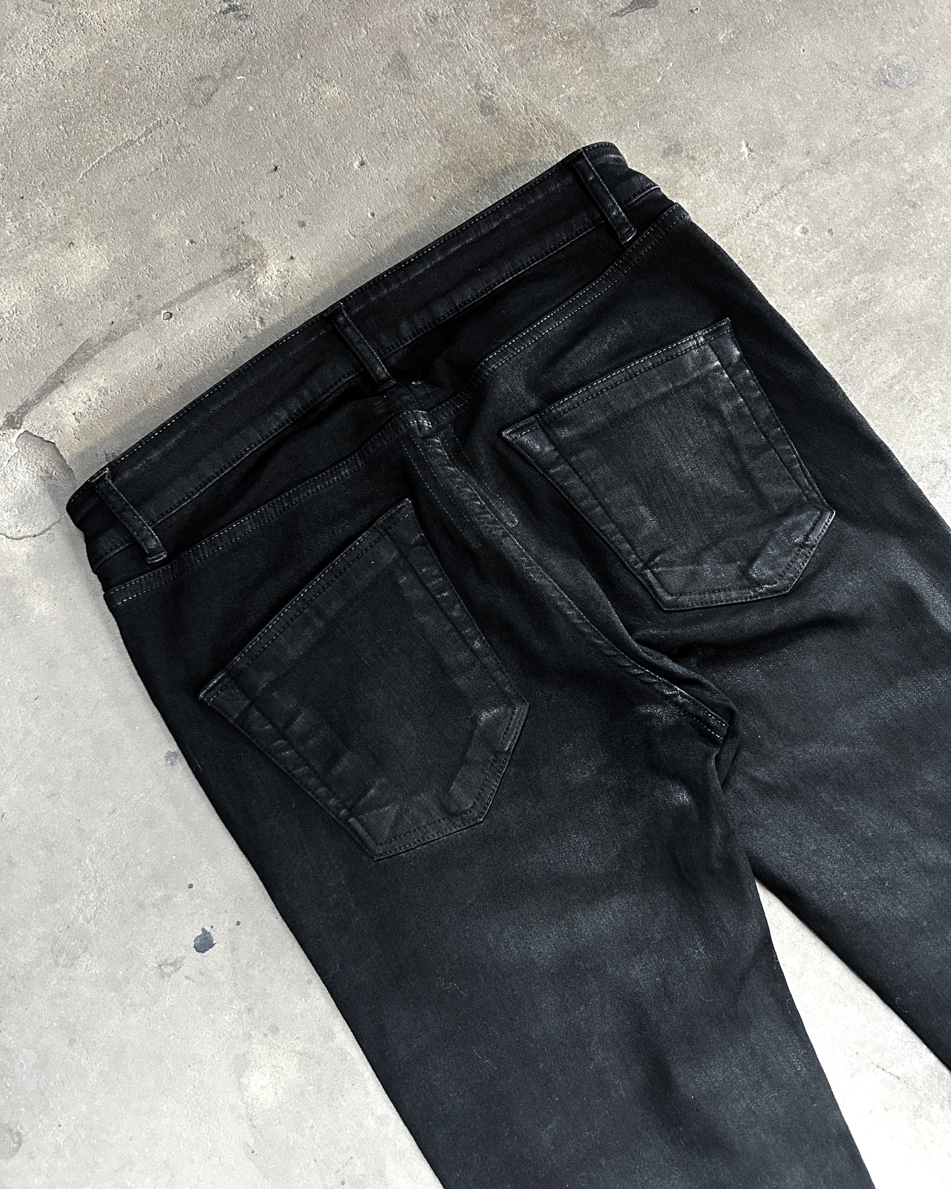 For sale is a pair of Rick Owens tyrone cut denim in stretch black wax denim. Coming from the Spring Summer 2020 show so all of the wax is still intact and feels great. Long skinny fit for stacking up.