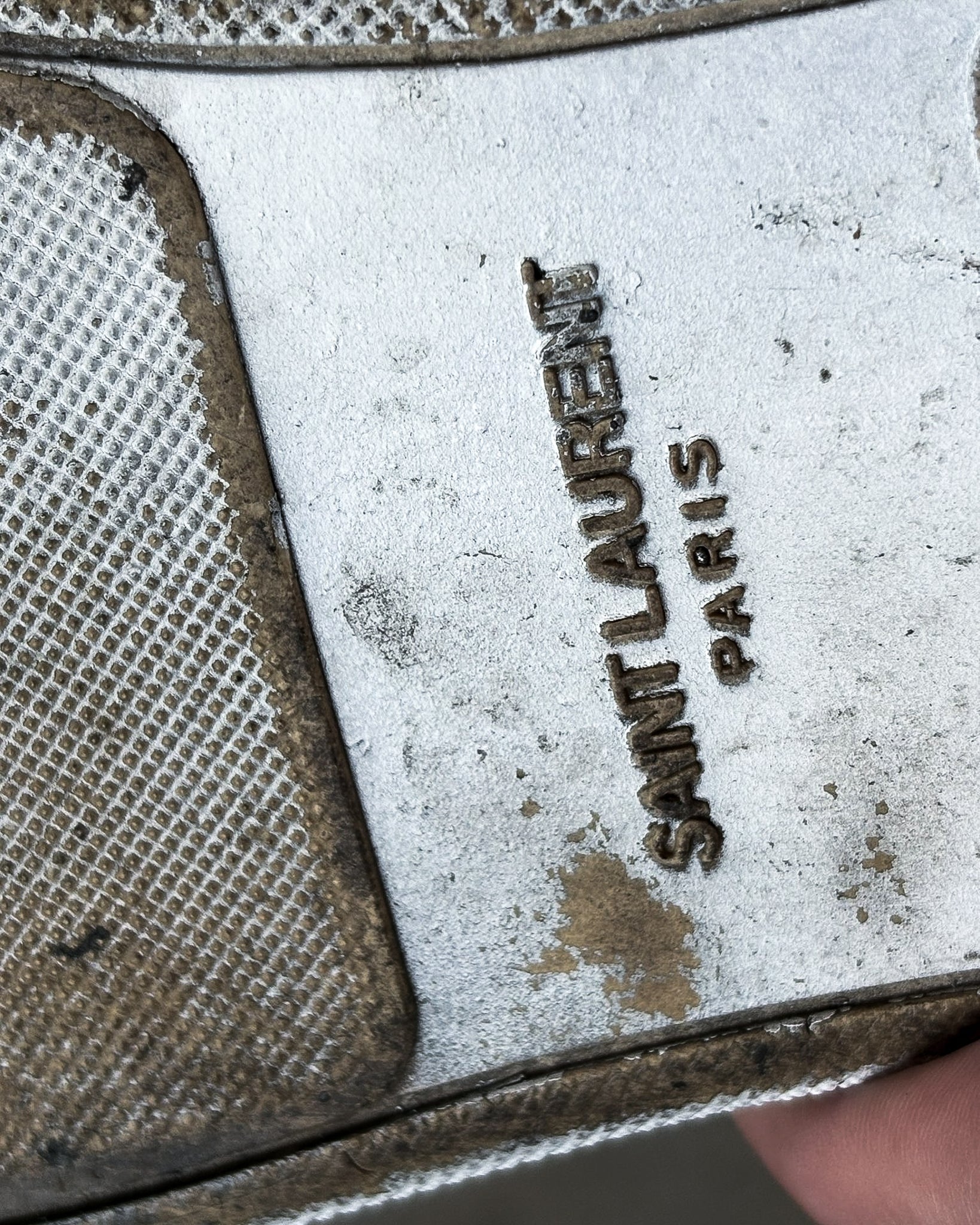 For sale is a pair of Saint Laurent Paris SL14H sneakers designed by Hedi Slimane. This model features a studded strap around the upper and a leopard fur panel on both sides. Were painted black then repainted white as they originally were.